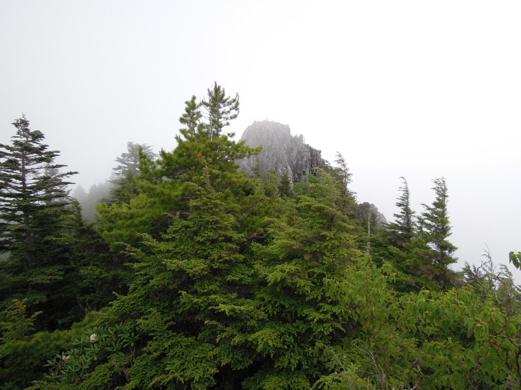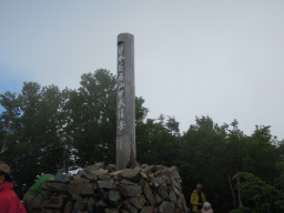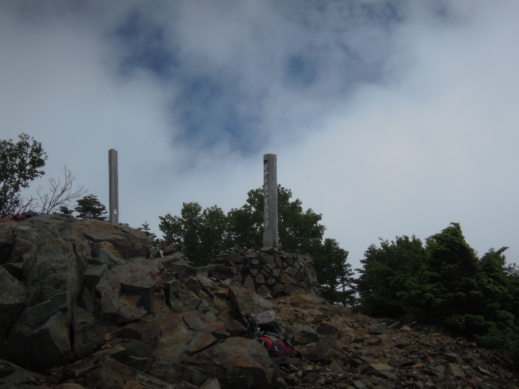 山頂は小広い岩場の広場になっています。広く視界が広がっている予定でしたが、あいにくのガスで何にも見えません。 |