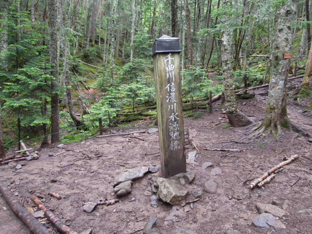 ここが、千曲川源流です。立派な標識が建ってます。千曲川が新潟県に入ると信濃川だそーで。 |