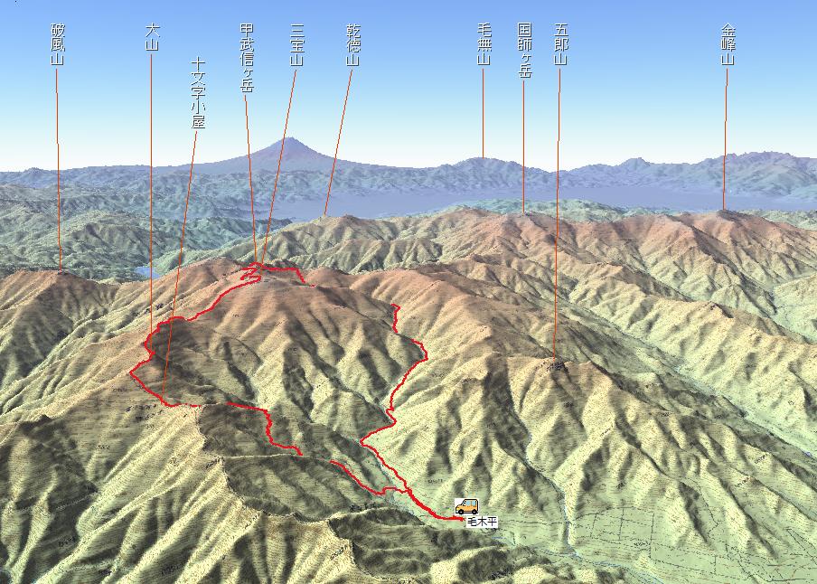 前方に大きな岩山が見えます。武信白岩山。ここはスルー。 |