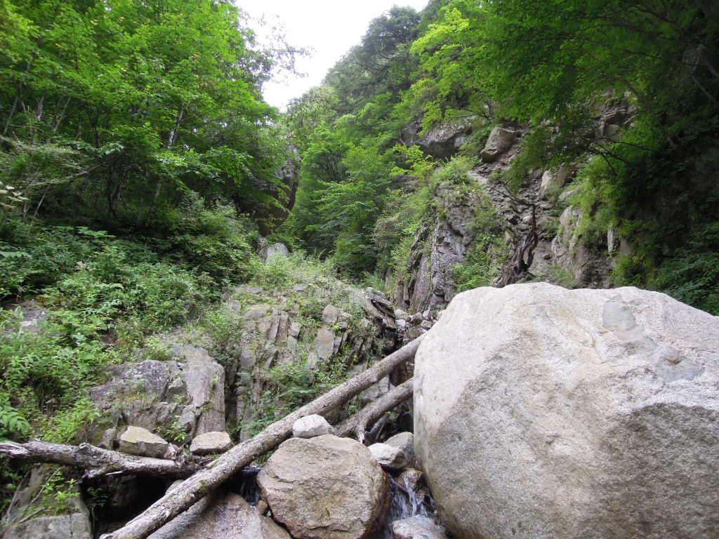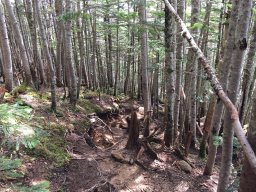 だんだんと急坂になってきます。沢沿いの登山道にありがちな一歩一歩を高く登らないとならない箇所が増えてきます。 |