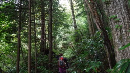 歩き始めは、こんな感じのうっそうとした森の中を進みます。このちょっと先でサルの親子とバッタリ。サルも慣れたもので平然と歩いていました。 |