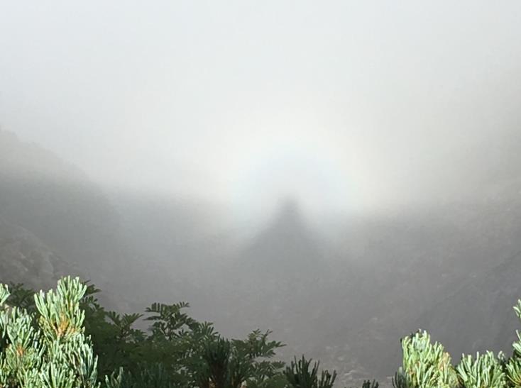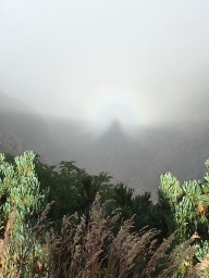 写真だとよくわかりませんが、自分の頭の影を中心にまん丸の虹がきれいに見えます。2〜3m隣に娘も立っているんですが、自分の影しか見えないんですね、感動しました。 |