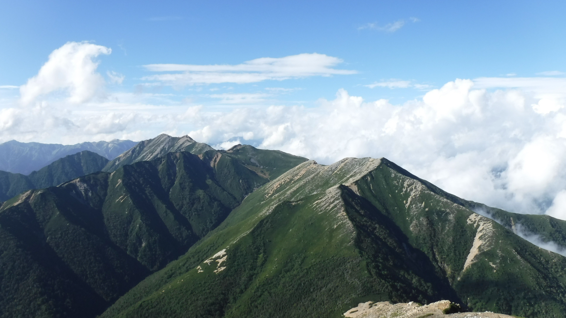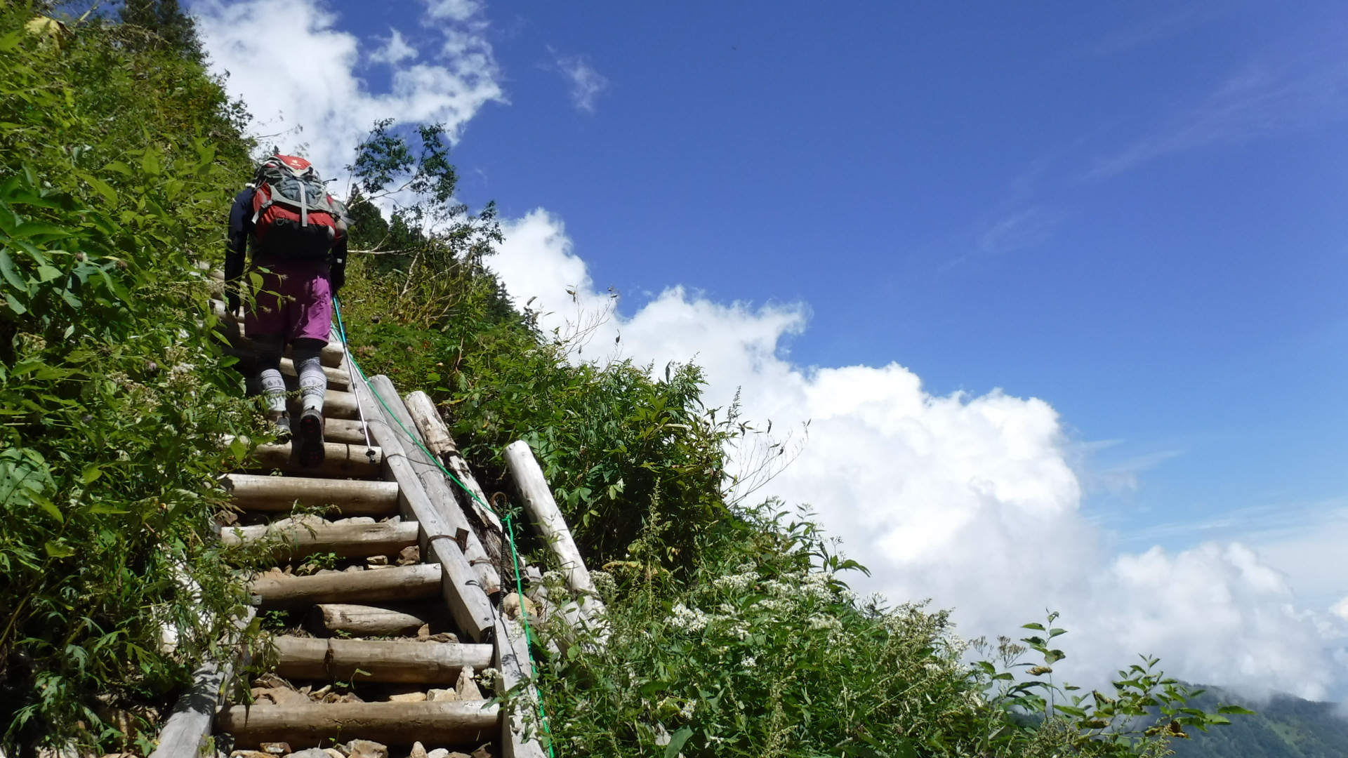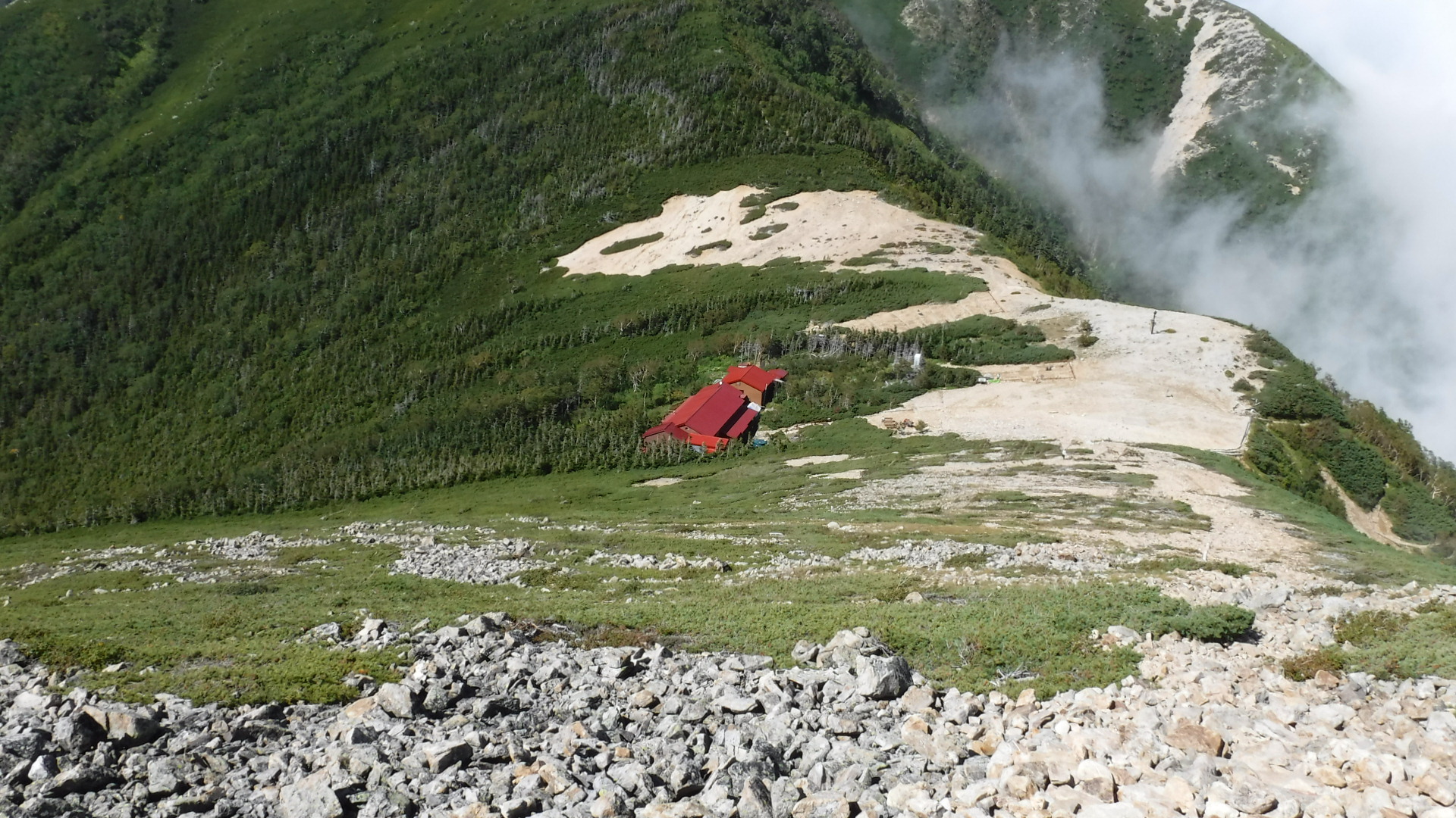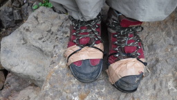 5年ぶりに履くとダメですね、最初は何ともなかったのですが、1日目の後半でソールが剥がれてきてしまいました。手持ちのガムテープで補強しましたが、岩場ではすぐ切れてしまいます。山小屋で結束バンドをもらってなんとか無事に下山できましたが、これからはこういった小物もリュックの隅に入れておかなければなりません。 |