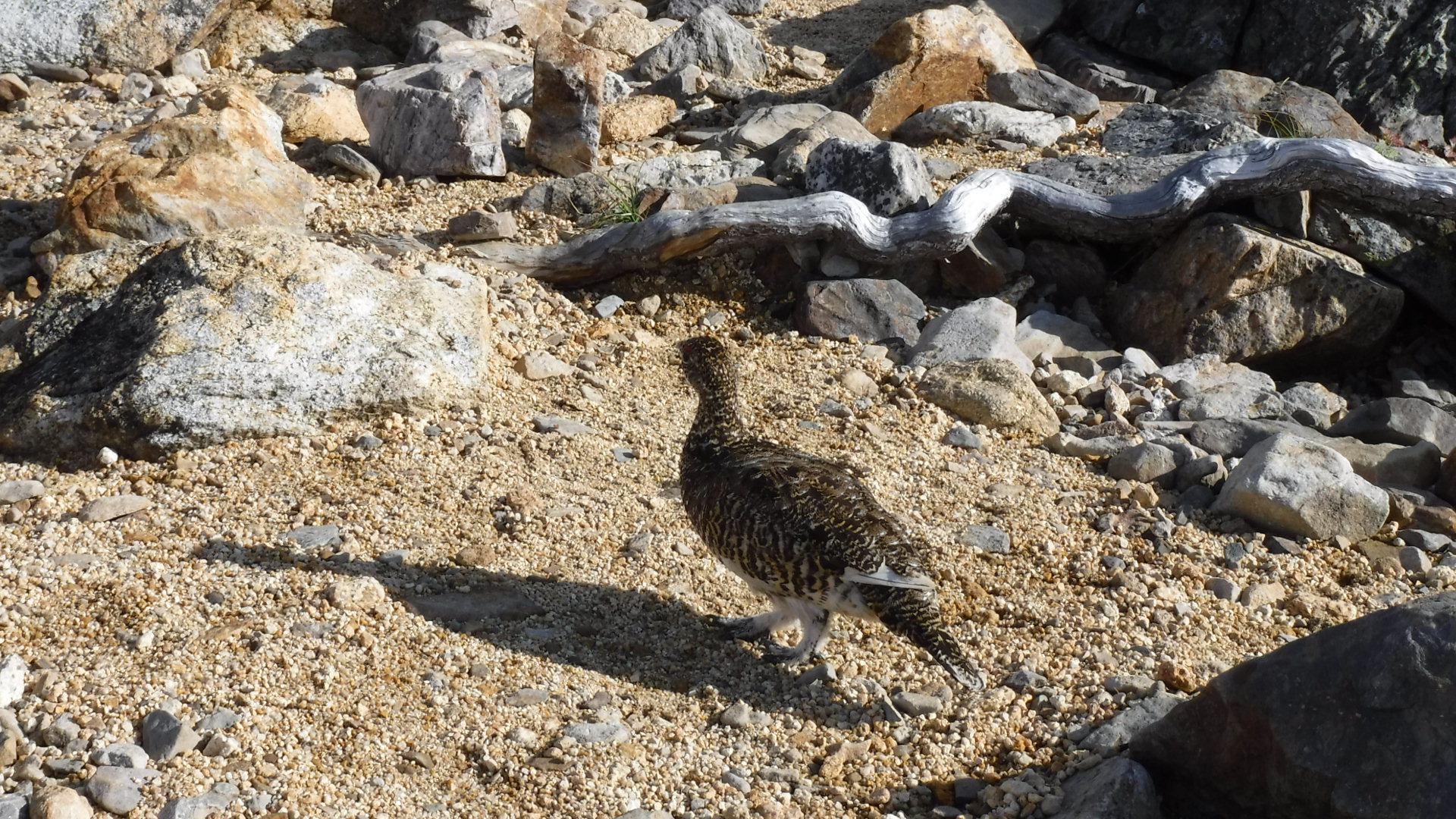 山小屋への下山途中、娘が呼んでいます。近寄ってみるとライチョウがいるじゃないですか!