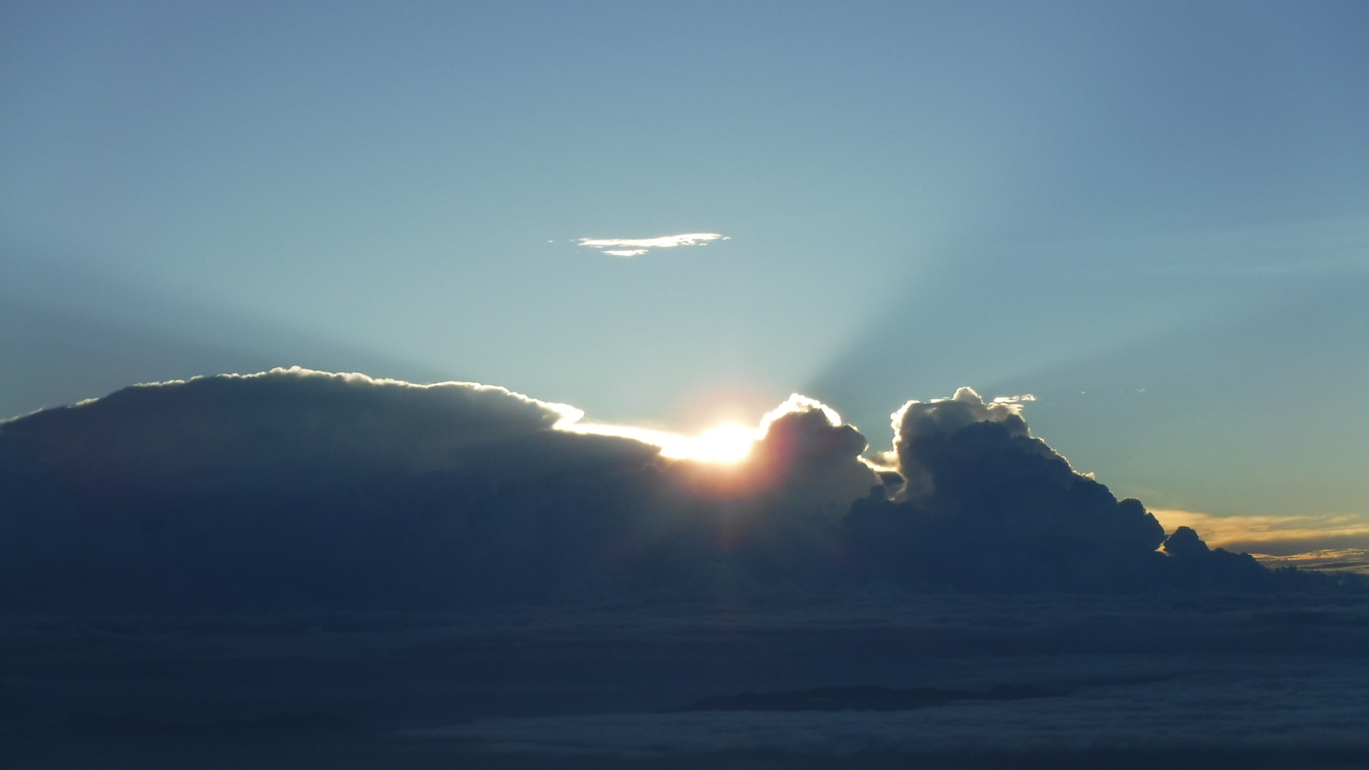 ただ、ちょうど太陽の登る群馬県方面は、分厚い雨雲に覆われています。だんだんと赤らみはじめ太陽が顔を出すって感じではなかったけど、雲の中からのご来光を拝むことができました。