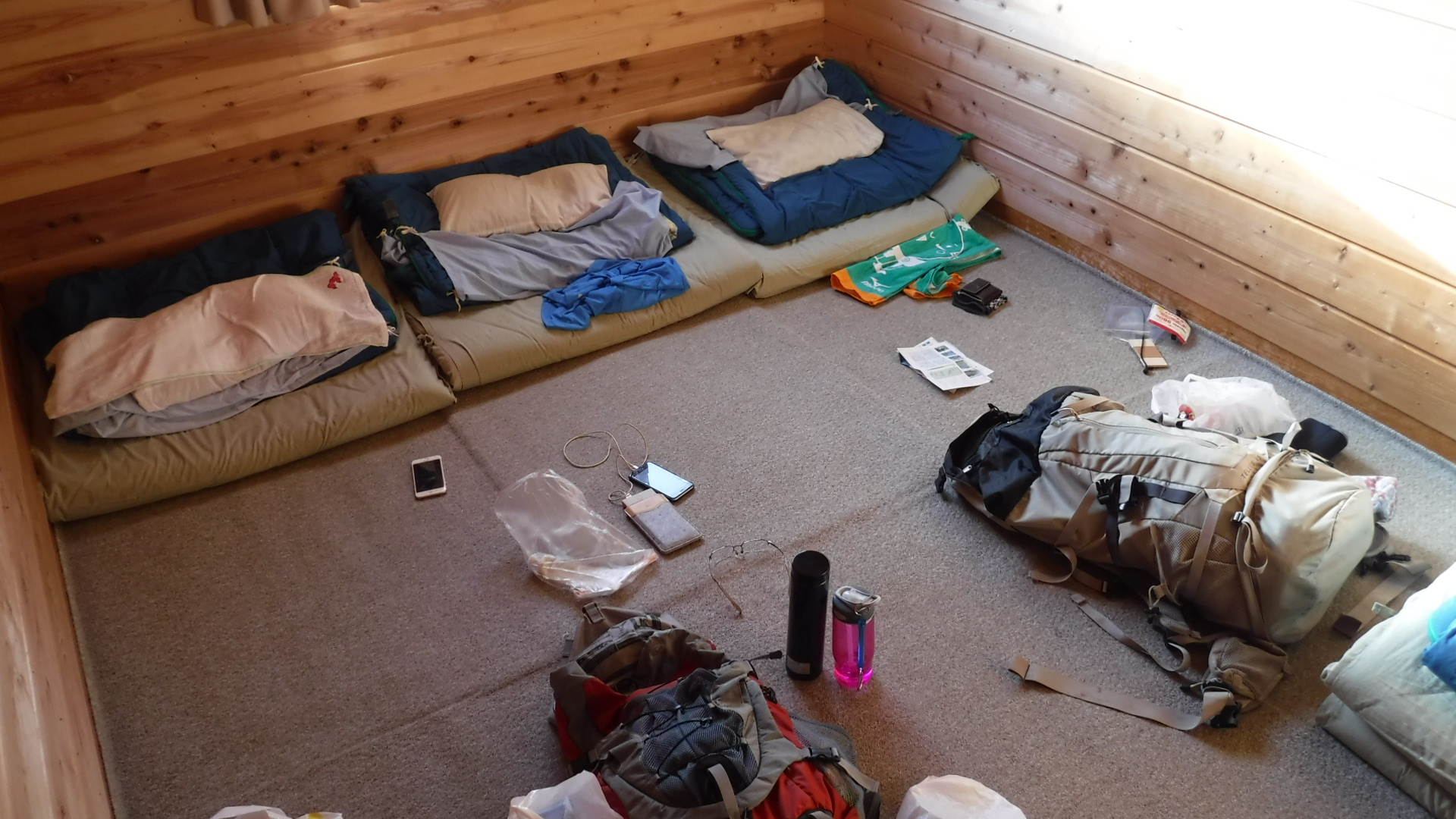 山小屋も空いていて、うちら親子だけの個室でした。おかげで部屋の中はちらかし放題。 定員は12名みたいです・・・。 |