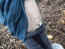 まったく痛くも痒くも無かったそうですが、裾をあげたらこの通り、しっかり咥え込んでます。 |