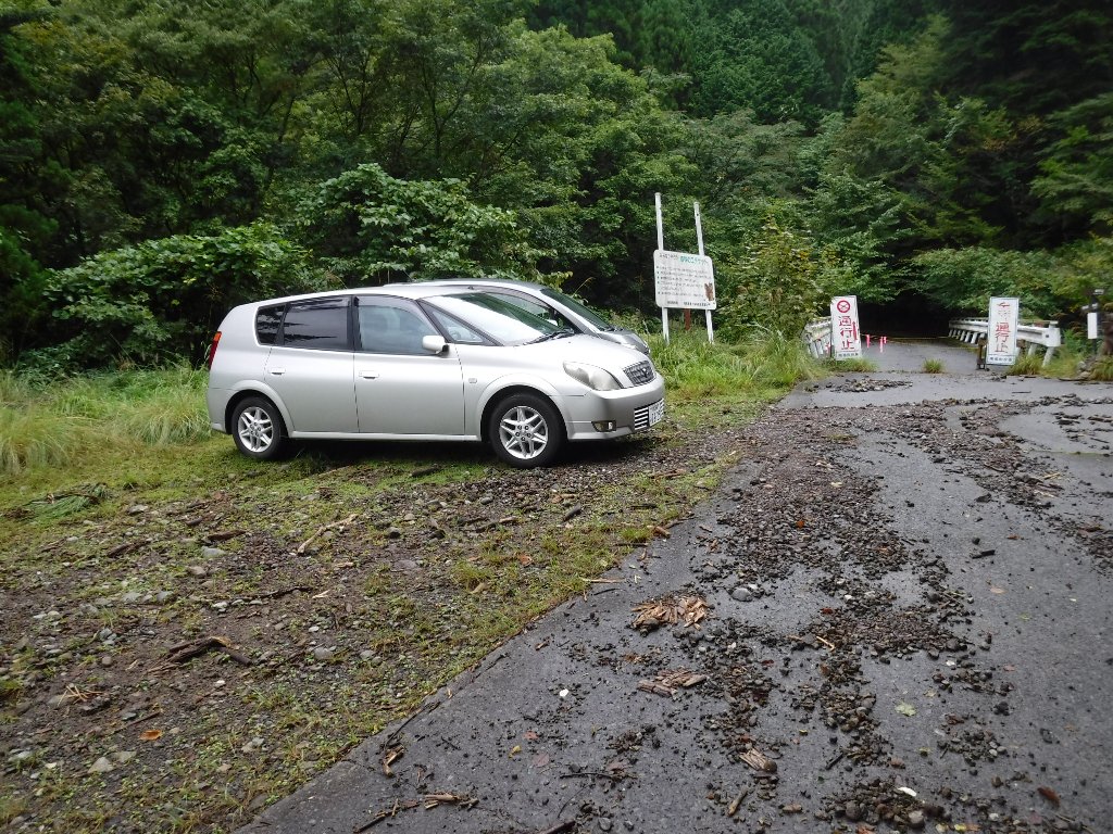 奥山温泉に向かって走り、奥山温泉への曲がり角を直進すると行き止まりになりここに駐車場があります。10台ほど駐車できる場所です。先に1台停まっていていました。こんな天気の日でも来る人がいるんだなあと思いましたが、この方は渓流釣りの方でした。 |