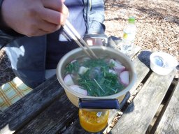 今日は、ハイキング気分で鍋を用意しました。雑煮です。餅と鶏肉、かまぼこ、白菜、ニンジン、水菜、なかなか立派な雑煮ができました。山で料理すればなんでも旨い!