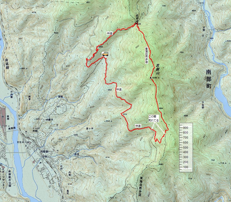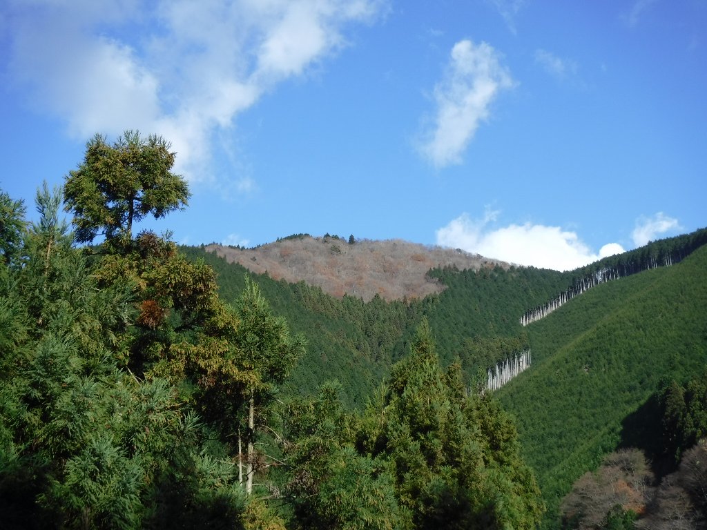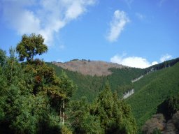 林道に出たら、車のある場所まで30分ほど会うきます。左の写真は、林道から見た山頂です。 |