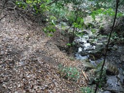 沢に降りる手前に「不動の滝」に寄ってみることに。しかしちょっと進むと登山道は大荒れ、おまけに昨夜の雨でやばそうな感じ。登山道が明確でないってことは、大した滝じゃあないだろうって事で、無理せずあきらめ元の場所まで戻る。 |