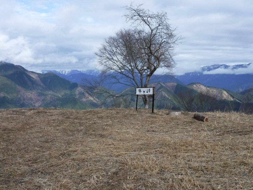 林の中を抜けるとほどなく山頂に到着。 高山って書いてあるかと思ったが「牛ガ峰」って書いてある。視界は良好だが残念なことに富士山は雲の中。 |