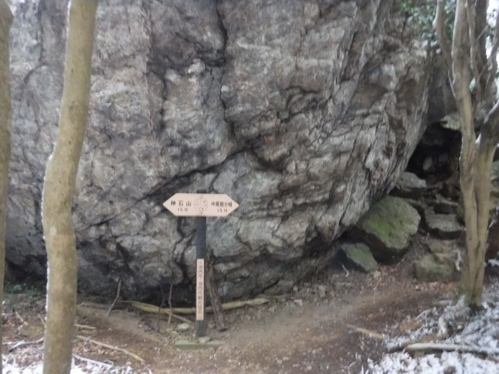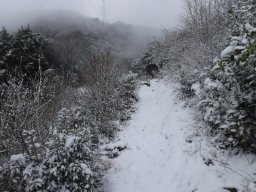 嵩山からはそのまま東に降りて、ぐるっと回り、梅田峠へ出る。それから看板に従って神石山へと向かう。ハイキングコースはいい感じに雪が積もった木々に囲まれ白いトンネルのようだ。 |
