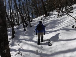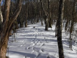 このぐらいの積雪だと、雪の下に根っこが隠れている場所が滑りやすい。注意して進むが全員何回かこけてしまった。 |