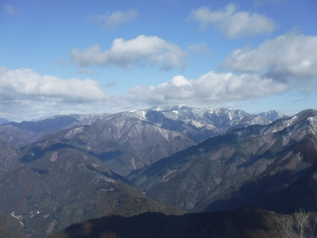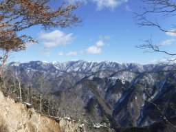 麻布山、前黒法師山あたりだろう、遠くは南アルプスの白い頂も見えている。 |