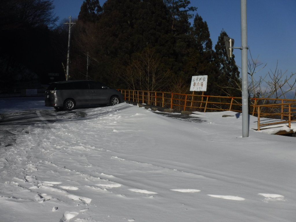 152号線を水窪に向かい向市場から山住神社に向かう。途中、路面凍結している箇所がある。スタットレスタイヤを履いているが慎重に進む。山住峠の駐車場に停車、他の車はいない。 |
