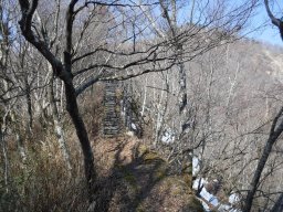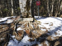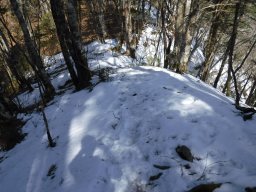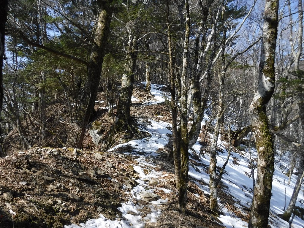 だんだんと白いものが増えてきた、白いだけならいいがその下が凍っている。滑って非常に歩きずらい場所が多い。軽アイゼン持ってきてよかった、使わないだろうと思っていたが、このあたりで装着。 |