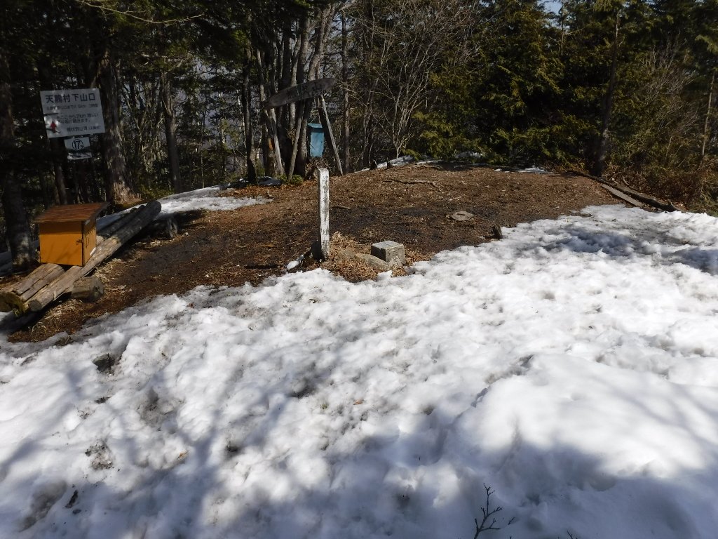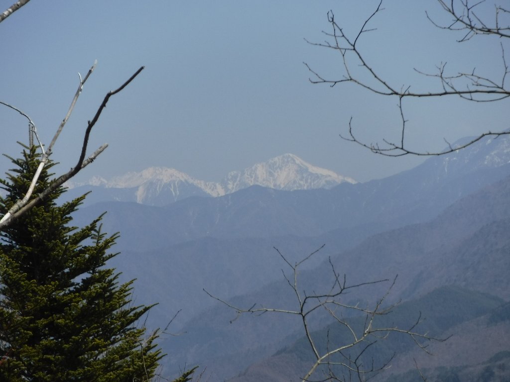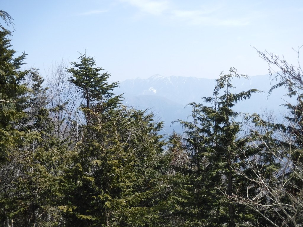 山頂は360度の展望はないが、東方面には開けている、南アルプスの白い山々が遠くに見える。 |