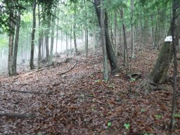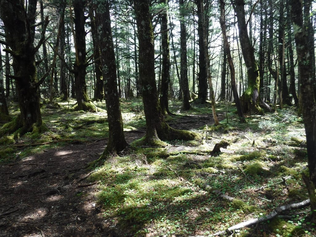 原生林の中を歩く。今回の山登りでこのあたりが一番楽しく気持ちのいい場所だった。 |