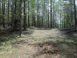 林を抜けると急に視界が開ける。裸山への分岐である。右側の小高い場所が裸山である。 |