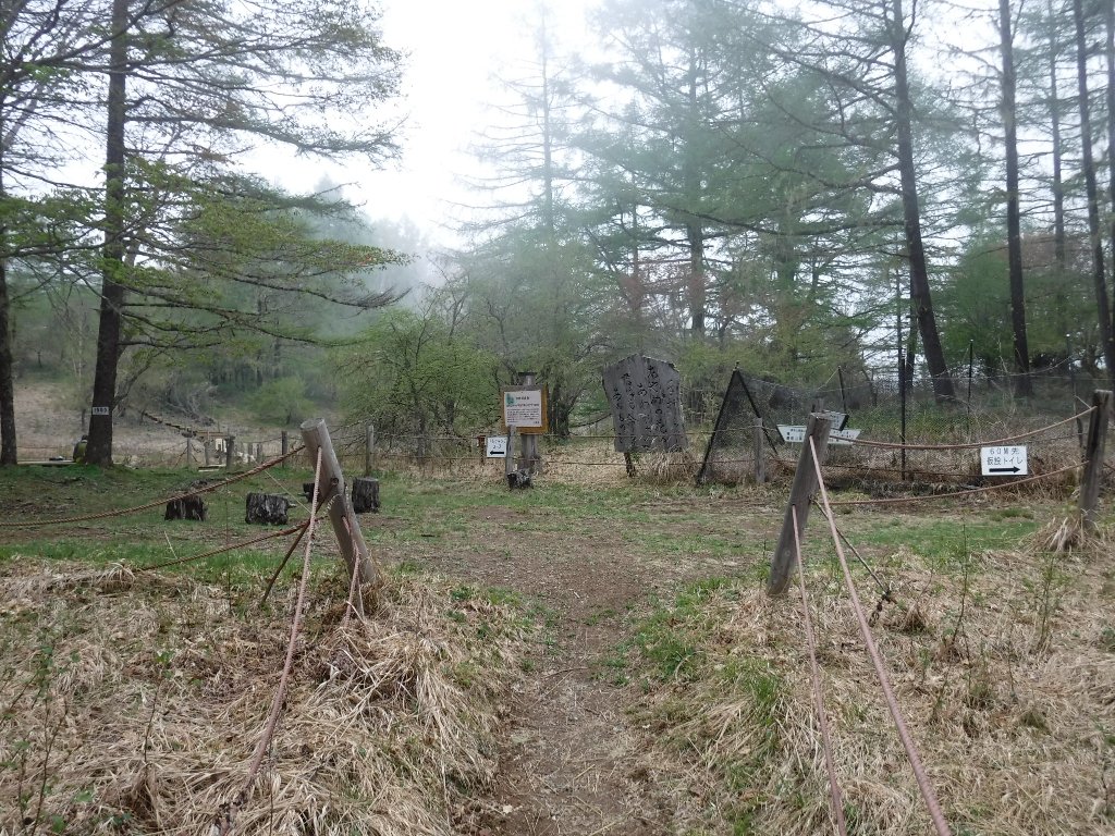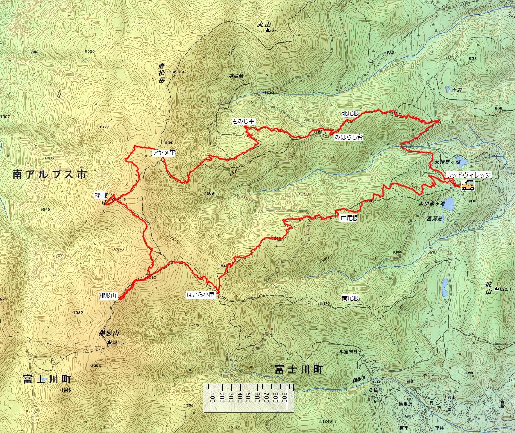 今回は北尾根を登り、中尾根を下る予定だ。ウッドヴィレッジの横の車道を歩き北尾根登山道へ向かう。 |