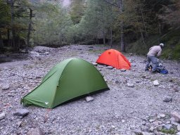 テント場一段目満員御礼、二段目もいっぱい、結局三段目のいちばん下のほうの小川を渡ったあたりにテントを設営しました。トイレや水場は遠いけど、のんびりできていい場所でした。