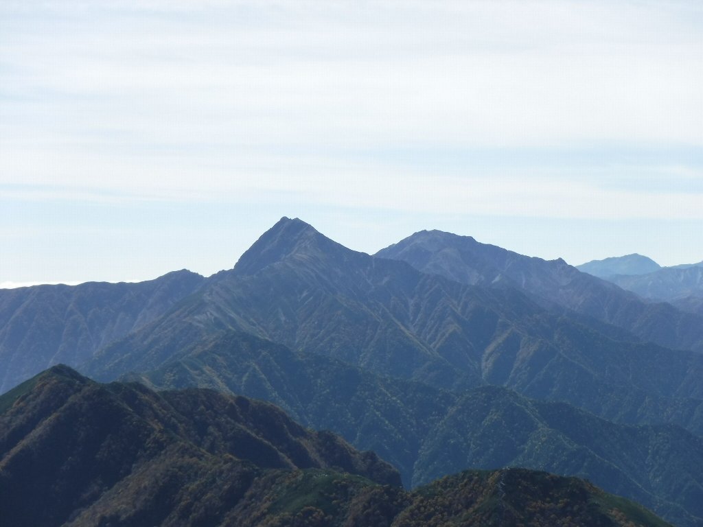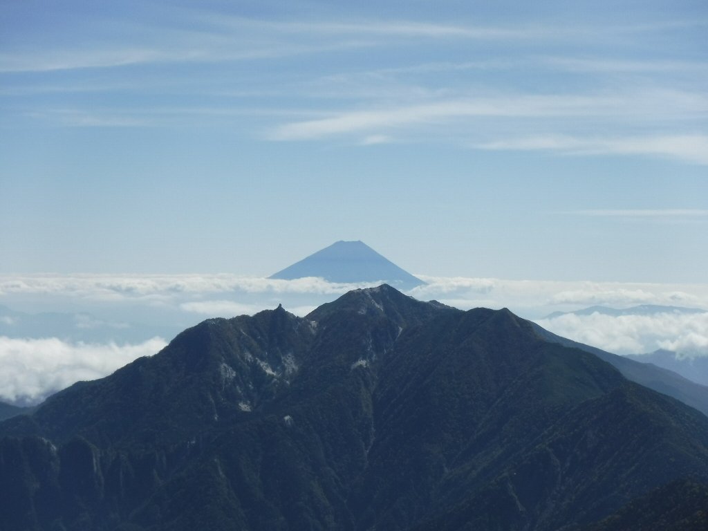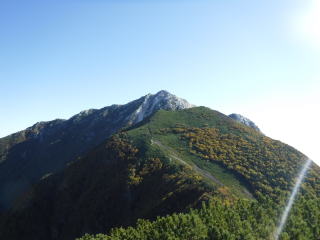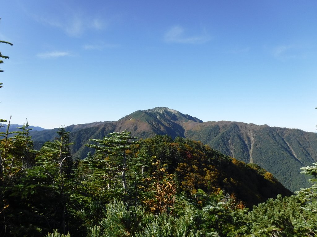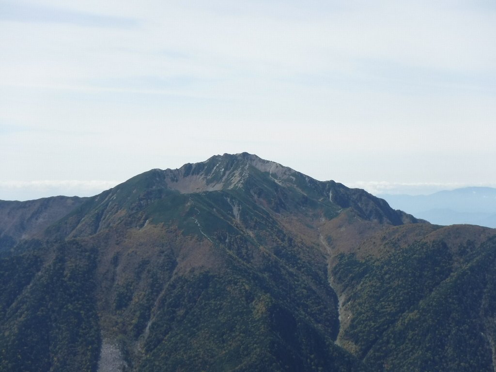 だんだんと木々が低くなってきます。振り返ると仙丈ケ岳、あそこにも今日は大勢の人が登っているでしょう。 |