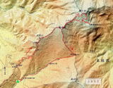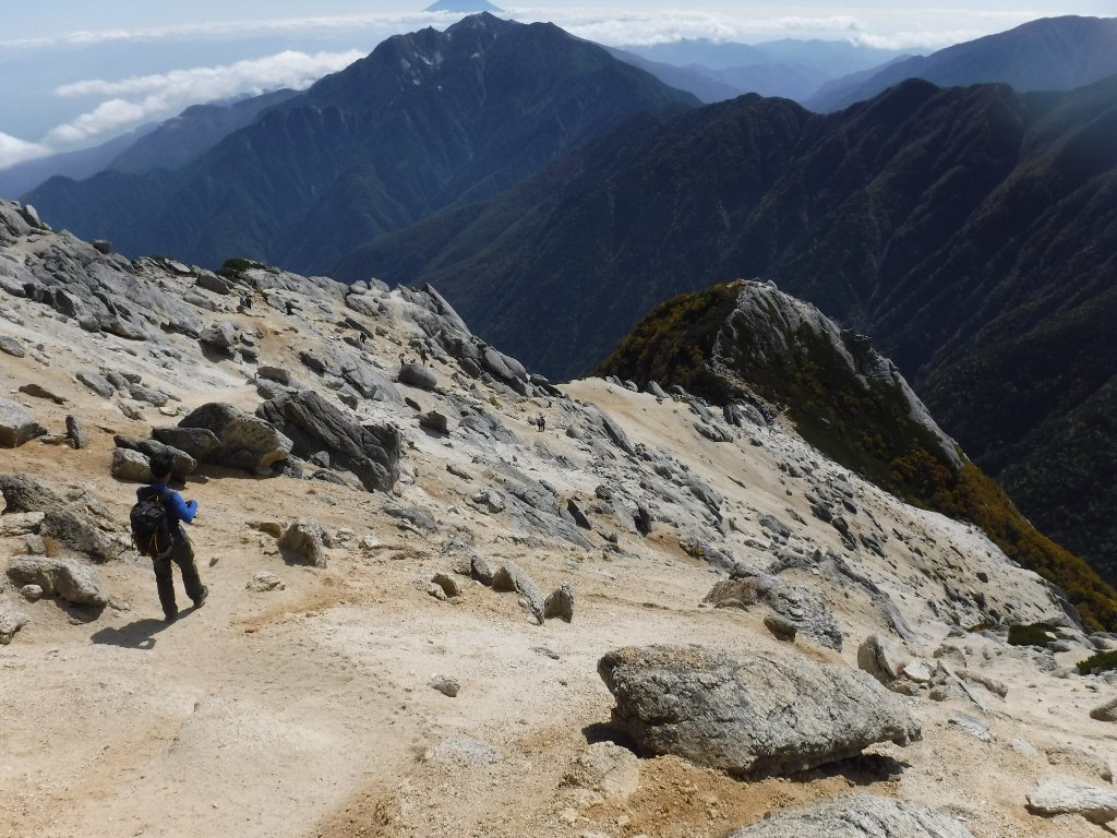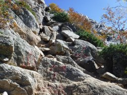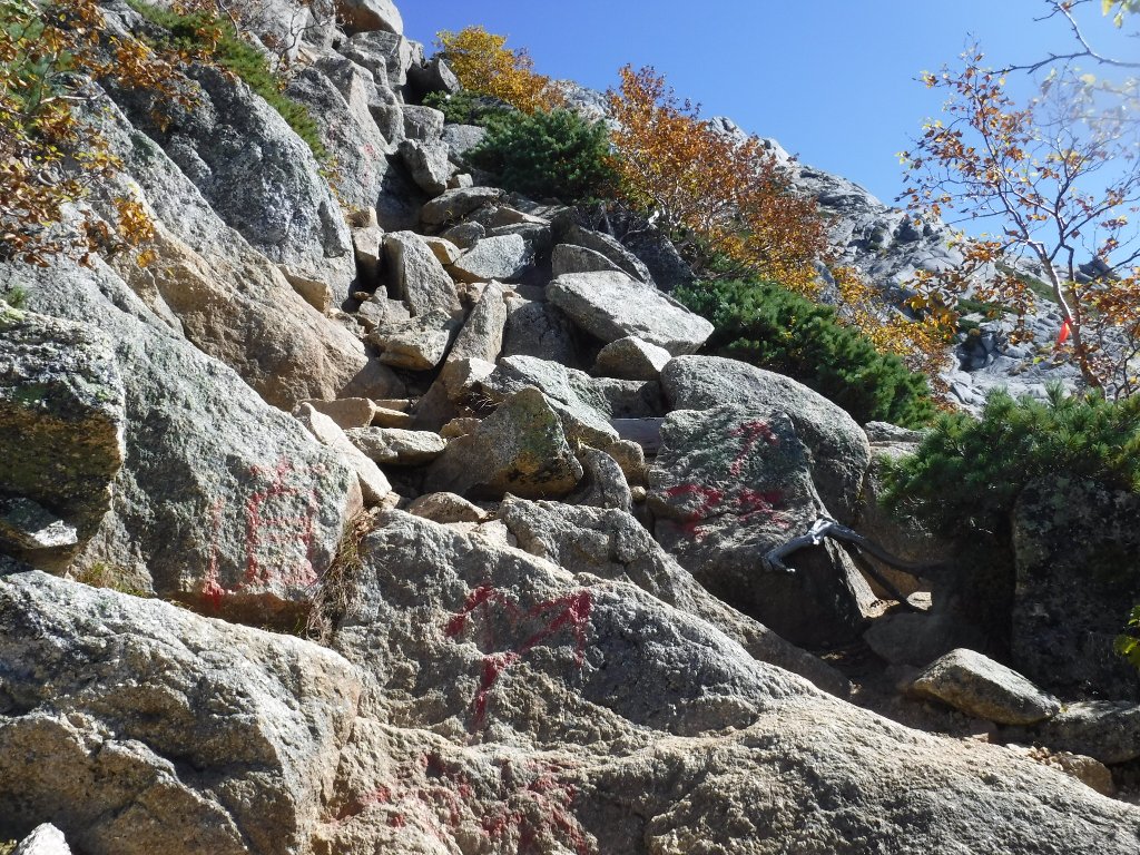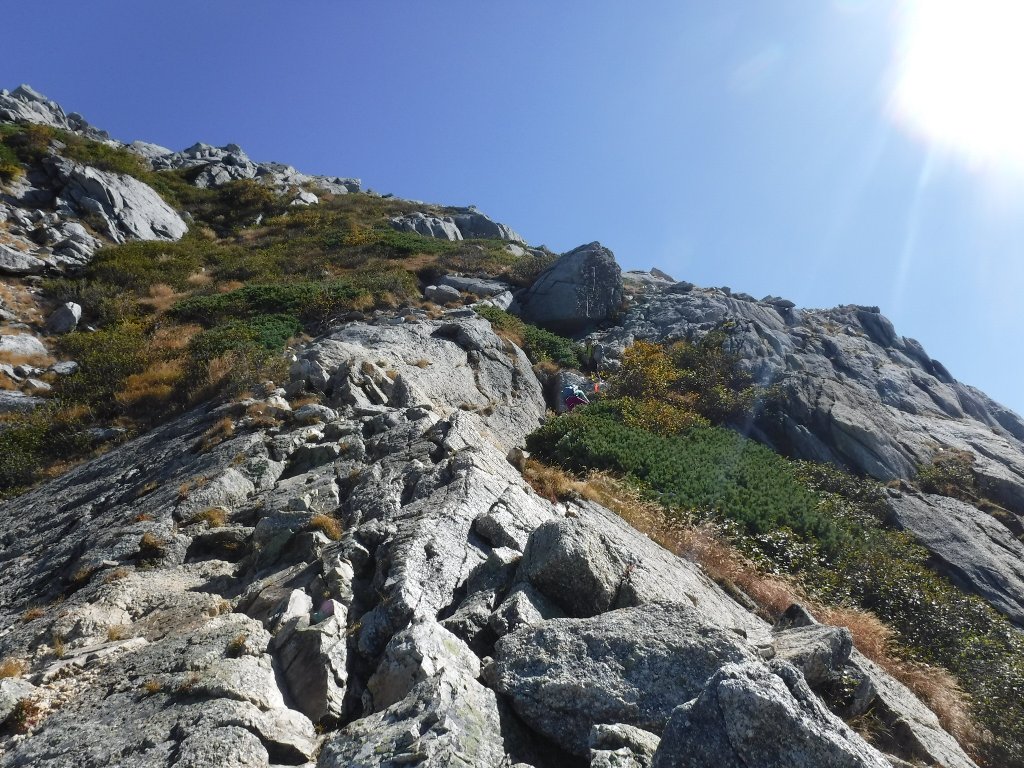 いくつかの岩場を通り過ぎると最後の登りにさしかかります。まっすぐ進むと直登コース、右が巻道コース。ここのために持ってきたヘルメットかぶって直登コースを進みます。 でもヘルメットかぶっている人はほとんどいませんでした。私がヘルメットかぶった時、どっちの道に行こうか迷ってたお兄さんがいました、私のヘルメットを見て巻き道に進んでいきました、迷わせてすみません。 |