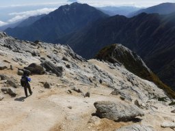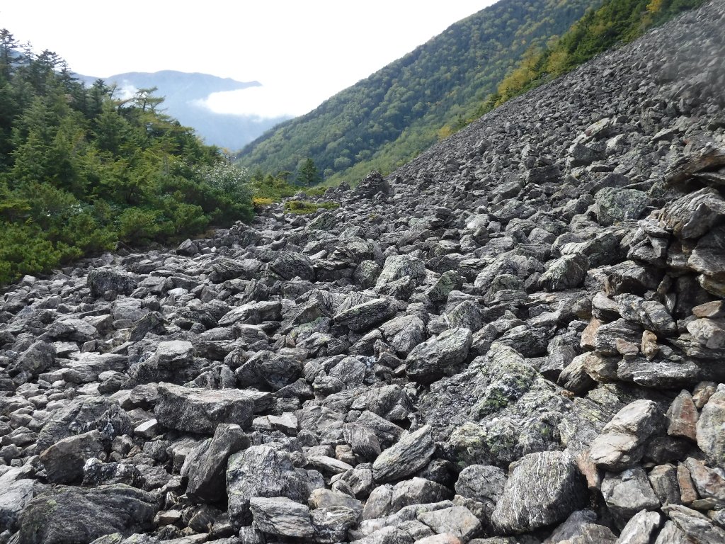 途中こんな石ころだらけの歩きにくい道を進むことになります。仙水小屋で美味しい湧水を飲んでテント場に向かいました。 |