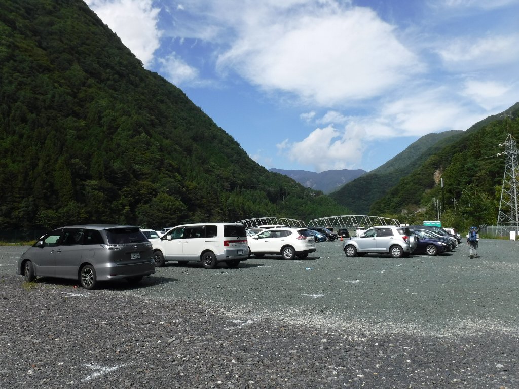 北沢峠には静岡側から行く場合、奈良田でバスに乗り広河原まで行って、そこでバスを乗り換えて行くことになります。ここは奈良田の丸山林道入口バス停前駐車場です。始発停留所の奈良田バス停は駐車場が狭くいっぱいだったのでここまで来ました。 |