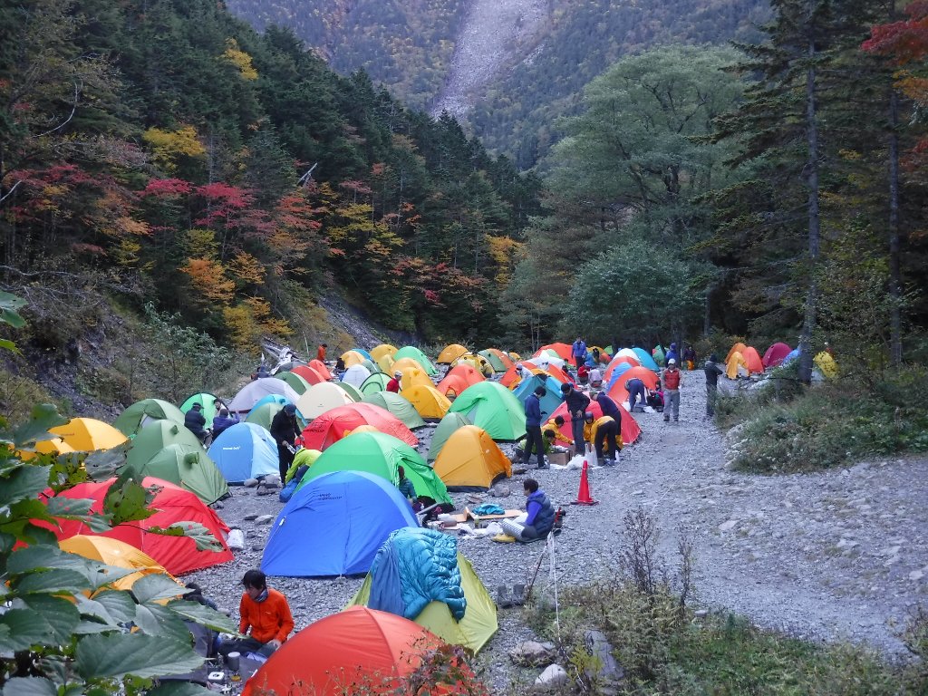 テント場はきれいなテント畑が広がっています。紅葉にはまだ早いけど、天気予報は晴れマーク、そりゃ混みますね。 |