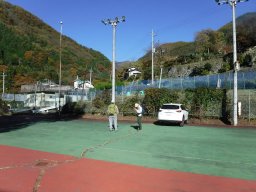 バス停前の駐車場は満車でした。そのすぐ上の第2?駐車場に駐車します、使わなくなったテニスコートのようです。 |