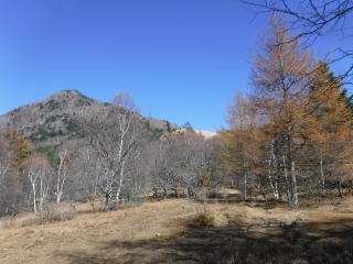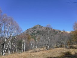 シラカバの林を抜けると急に視界が開け目の前に乾徳山が現れます。 |