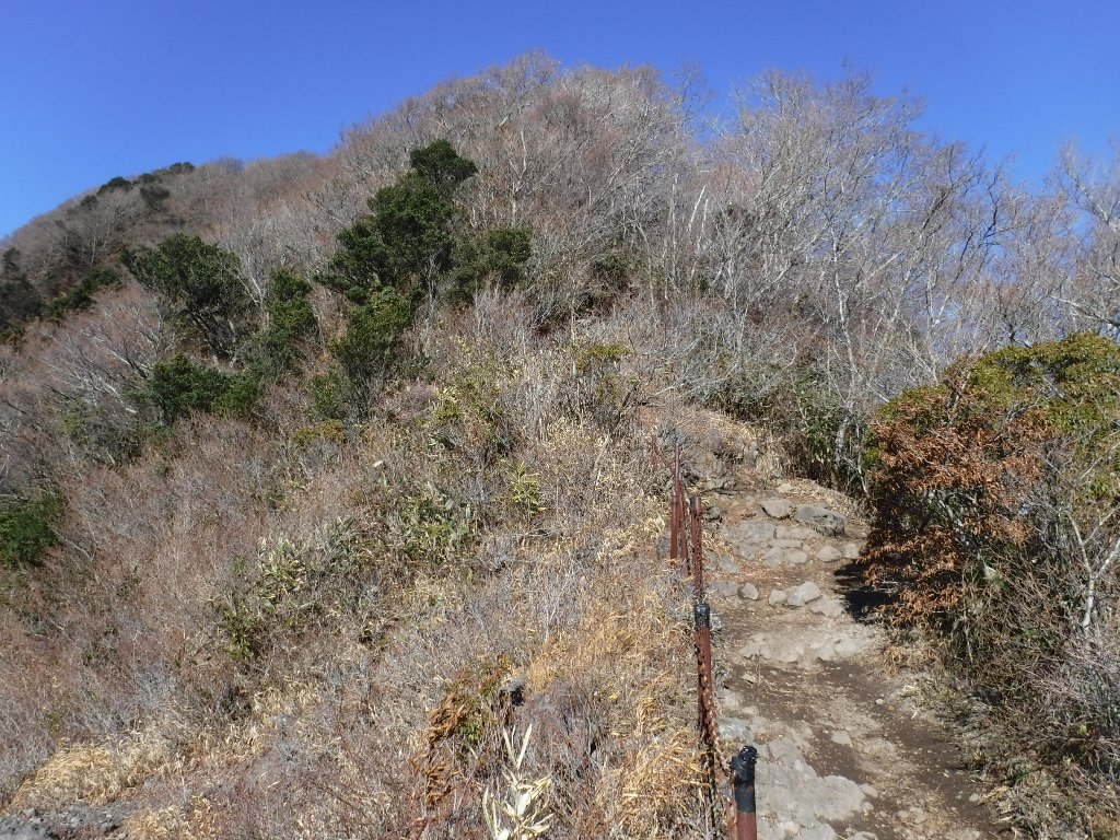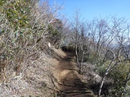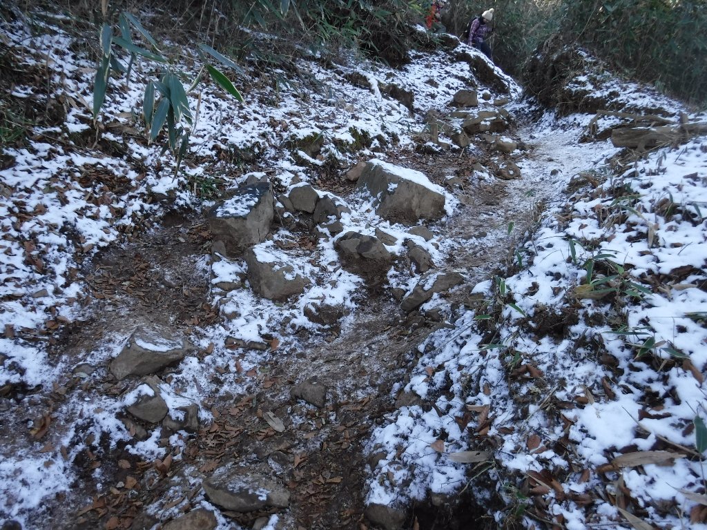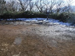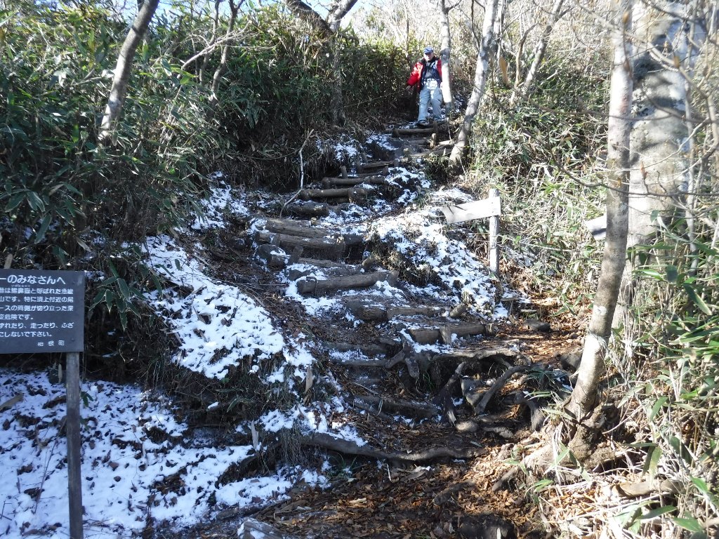 頂上直下の日陰の登山道にはうっすらと雪が積もってました。凍結している箇所も多く慎重に進みます。 |