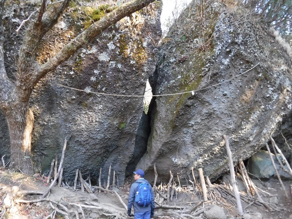ここが金時宿り石、でっかい岩が真っ二つに割れてます。 |