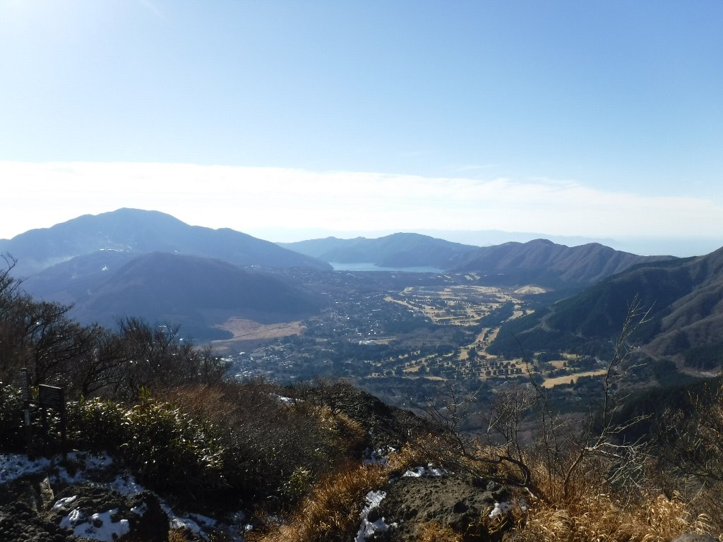 頂上からの芦ノ湖の眺めです、左の大涌谷からは湯気が立ちあがっているのが良く見えます。 |