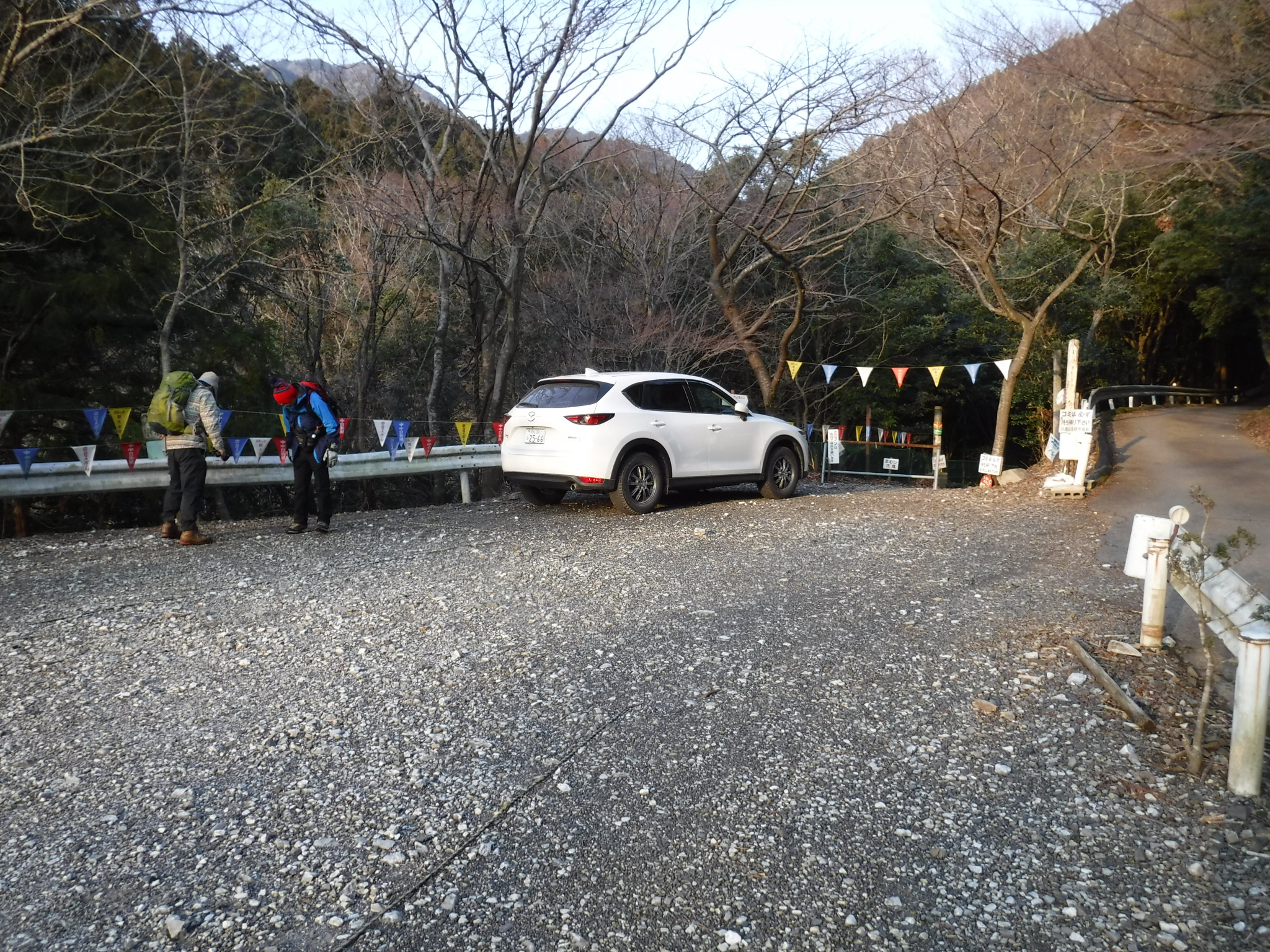 小岐須渓谷キャンプ場駐車場に車を停めます。広い駐車場で2〜30台は入りそうです。駐車場は無料で近くにはきれいなトイレも設置されてます。 |