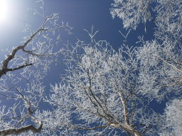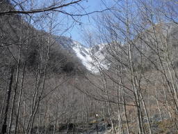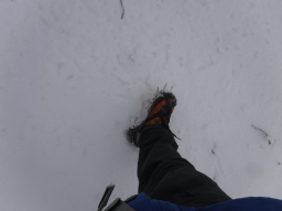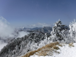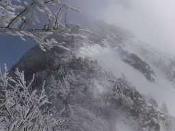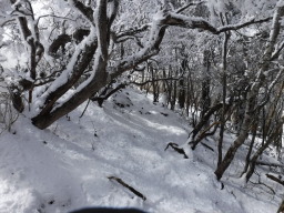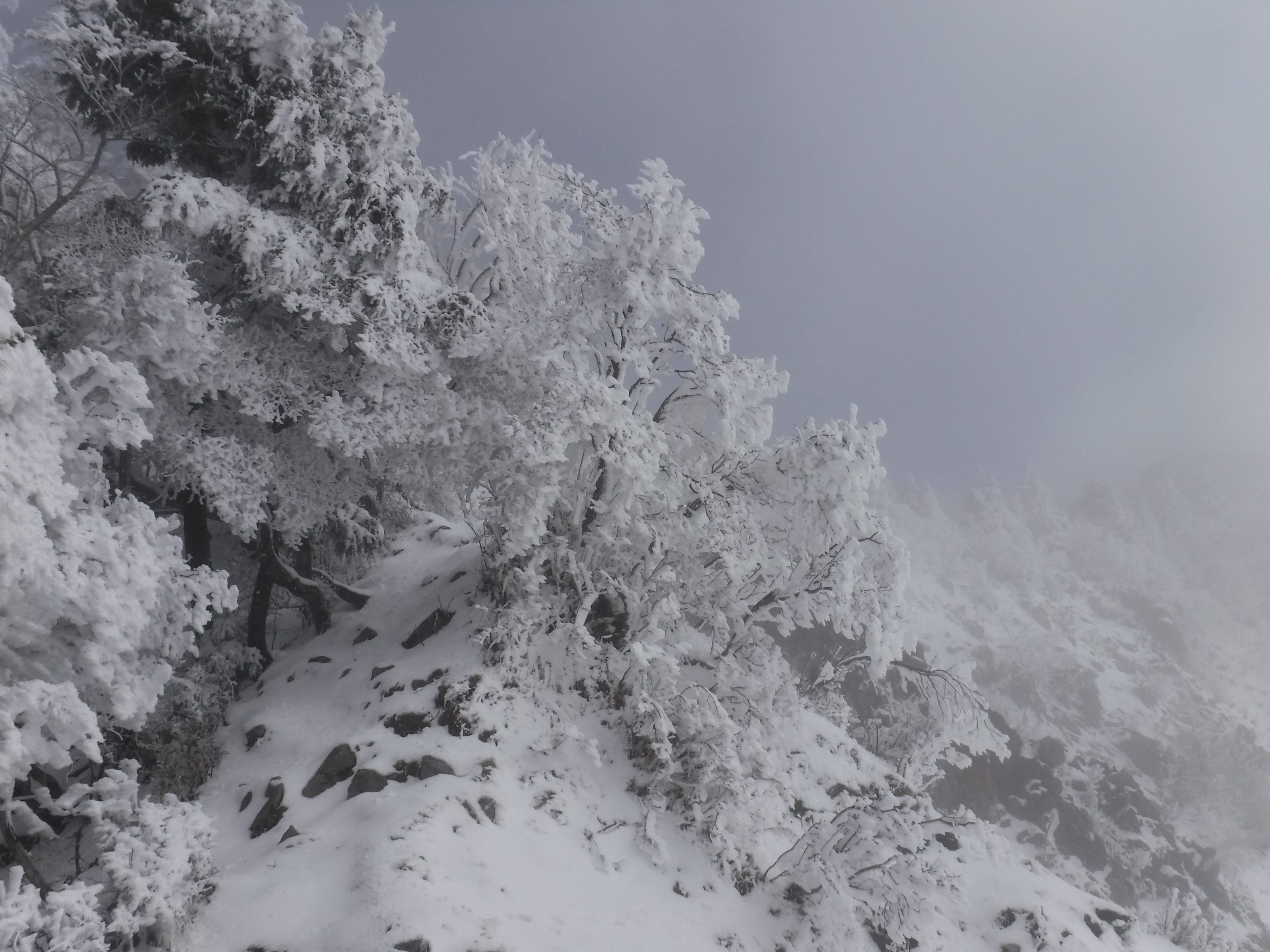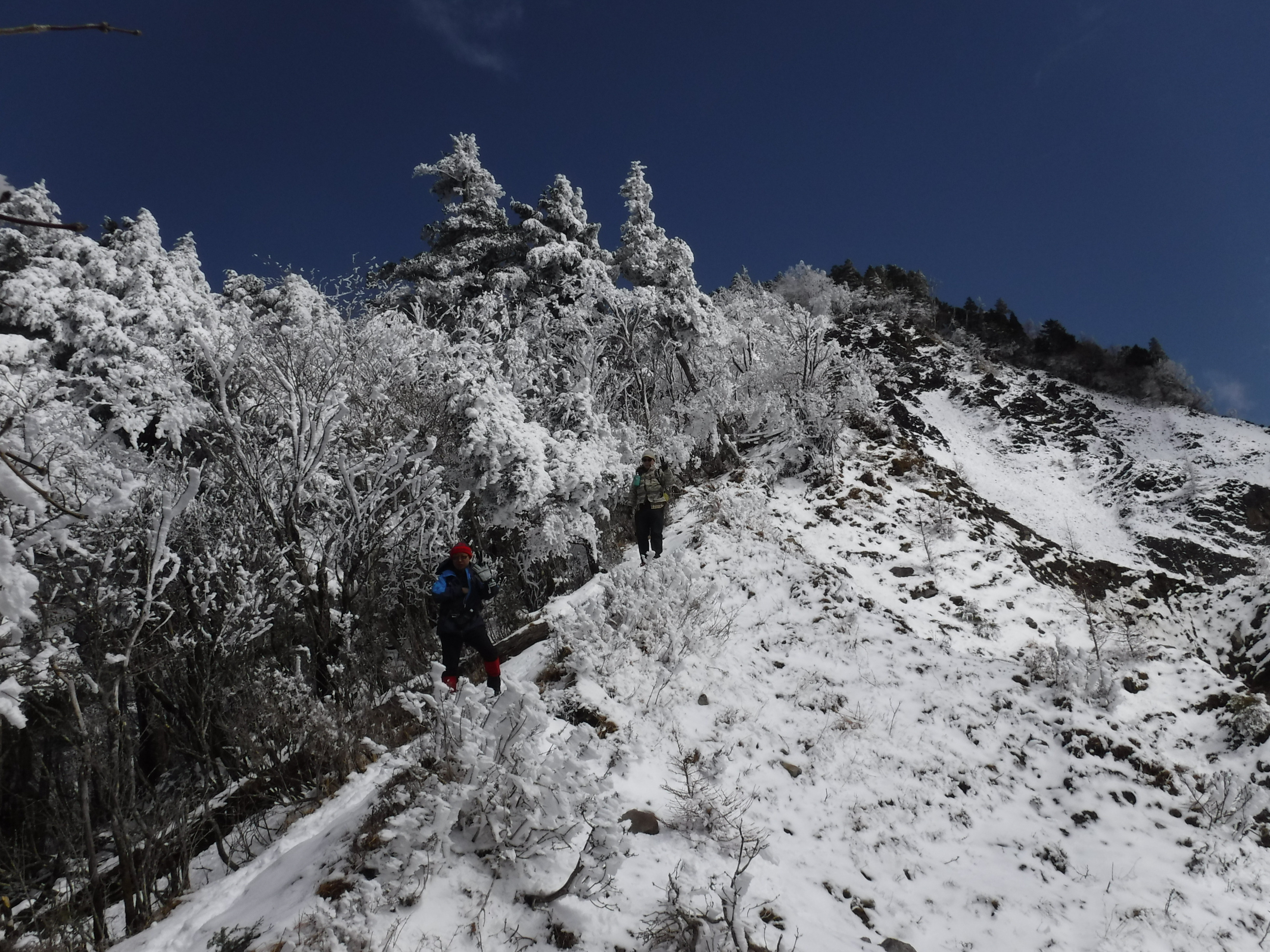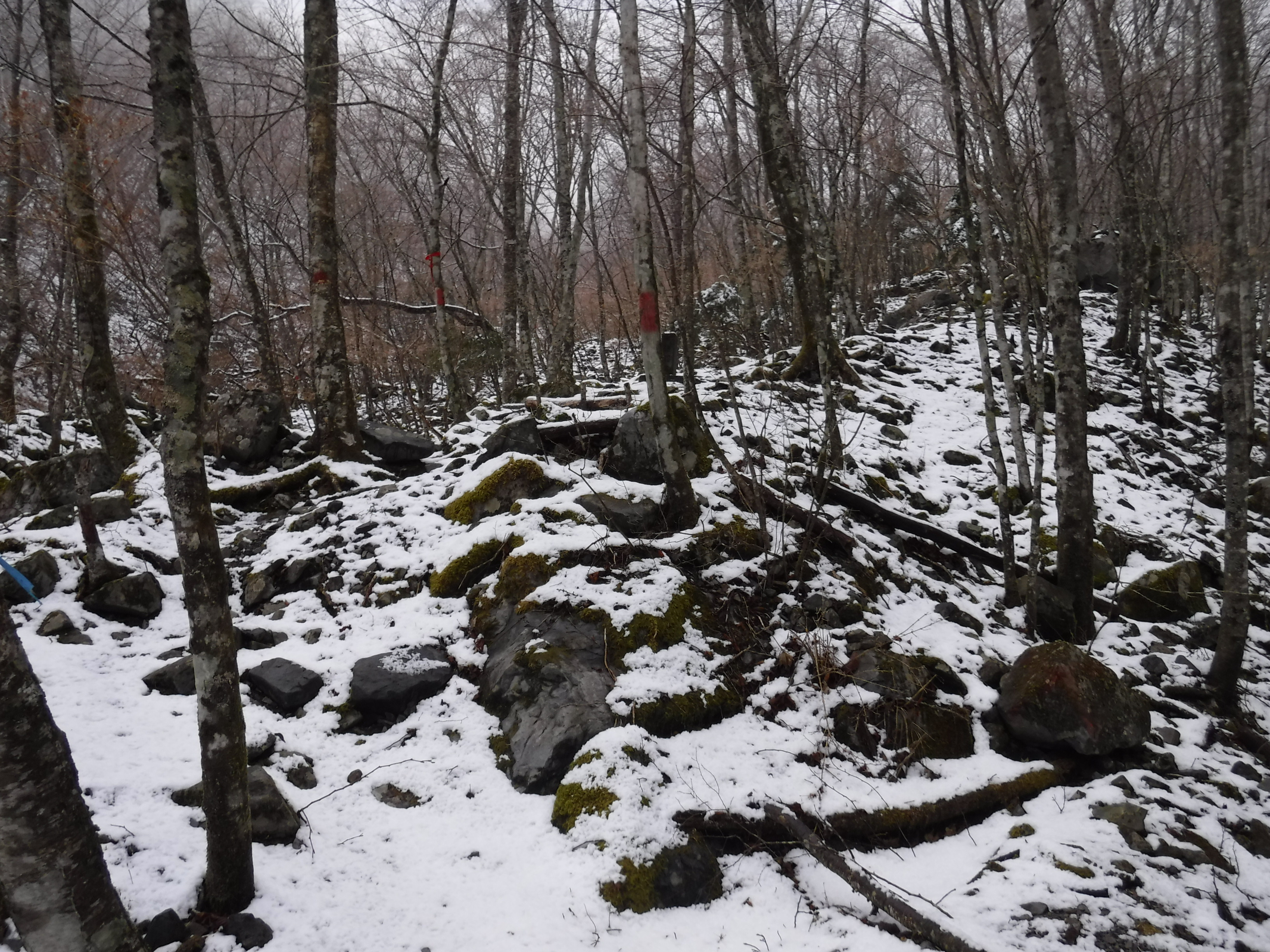 静かな樹林帯を抜けていきます。だんだんと雪が多くなってきましたが凍ってはいないのでアイゼン無しでも安心して進めます。 |