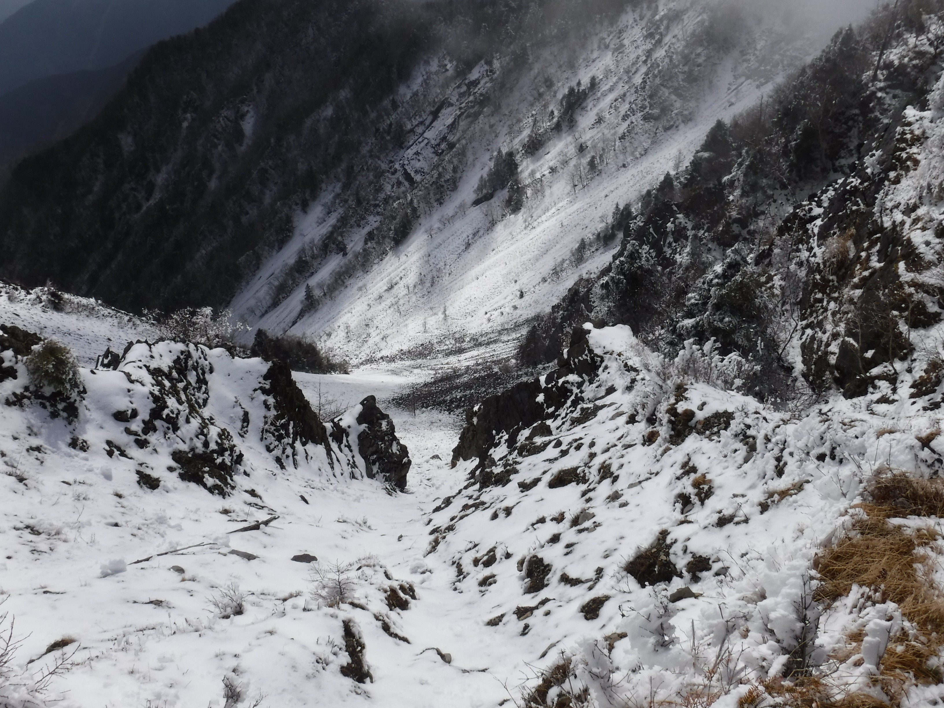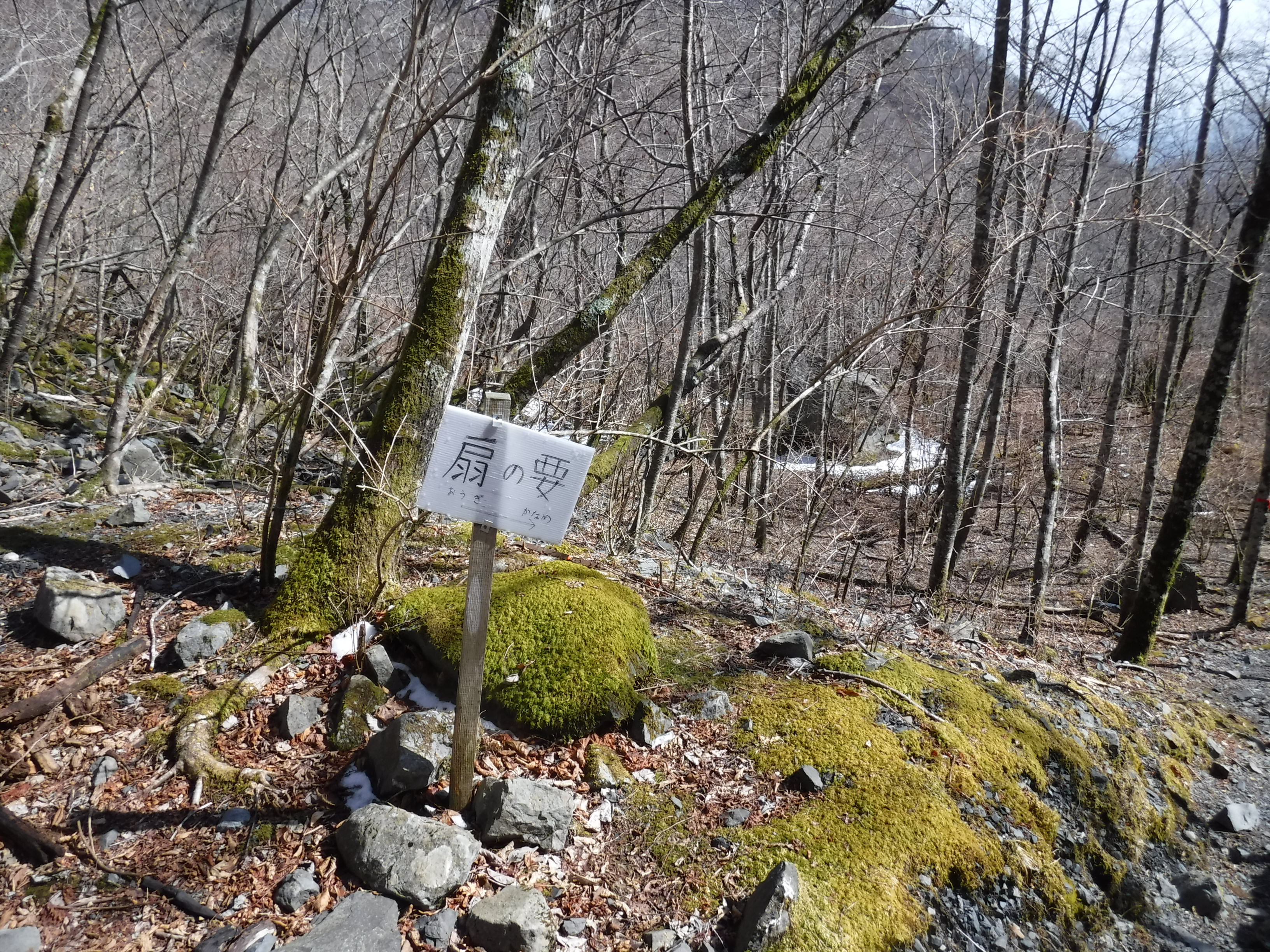 登るときには気が付かなかったのですが扇の要という場所です。 おそらくここを中心に大谷崩れが扇子のように広がっているのでしょう、すぐ先の大きな岩が止め金具かもしれません。 |