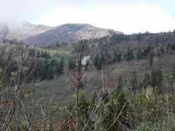 大きな荷物を背負って3時間、だいぶ疲れてきましたが、今日の目的地の高谷池ヒュッテが見えてきて元気も出てきます。林の中の三角屋根がいい感じです。 |