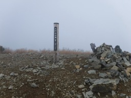 高谷池ヒュッテから1時間半ほどで山頂に到着しましたが、残念ながらガスの中。30分ほどぶらぶらしましたが晴れる気配もないので下山します。 |