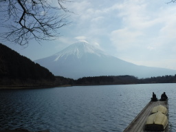 駐車場からは富士山がよく見えます。でもちょっと霞んでいますね。湖では釣りを楽しんでいる方が大勢います。 |