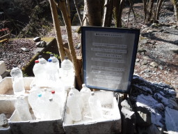 途中、水が入ったペットボトルが置かれています。鍋割山荘で使う水を登山者に少しずつ持って行ってもらうとのことです。体力自慢のチム君は2本、4人合わせて5本をザックに詰め込みました。 |