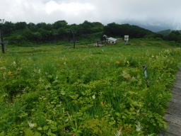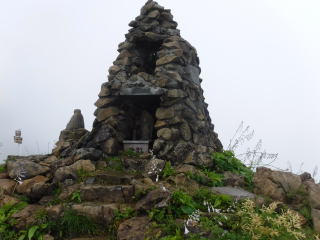 リフトを降りてちょっと歩くと地蔵ノ頭に着きます。晴れてたら目の前の八方尾根が広がっているはずなの残念です。 |