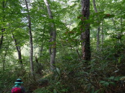 2〜3回、車道に出たりまた登山道に入ったりを繰り返します。ここは白樺の森。 |
