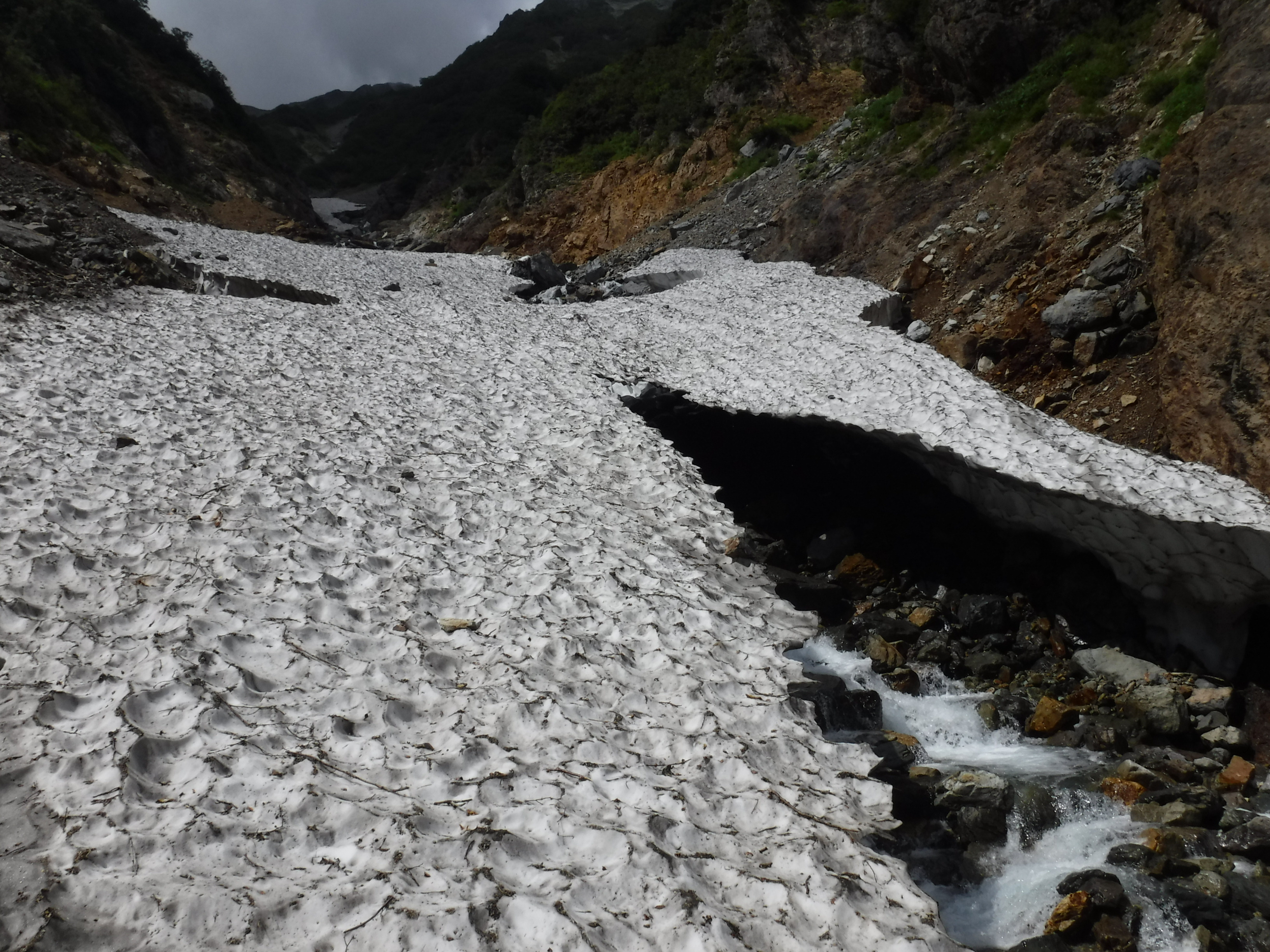 しばらく進むとだんだんと空気が涼しくなってきました。ここが日本三大雪渓の一つの針ノ木雪渓です。ただ、今回はすでに雪も溶け、雪渓歩きはできず雪渓の巻道を歩くことになりました。 |
