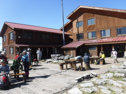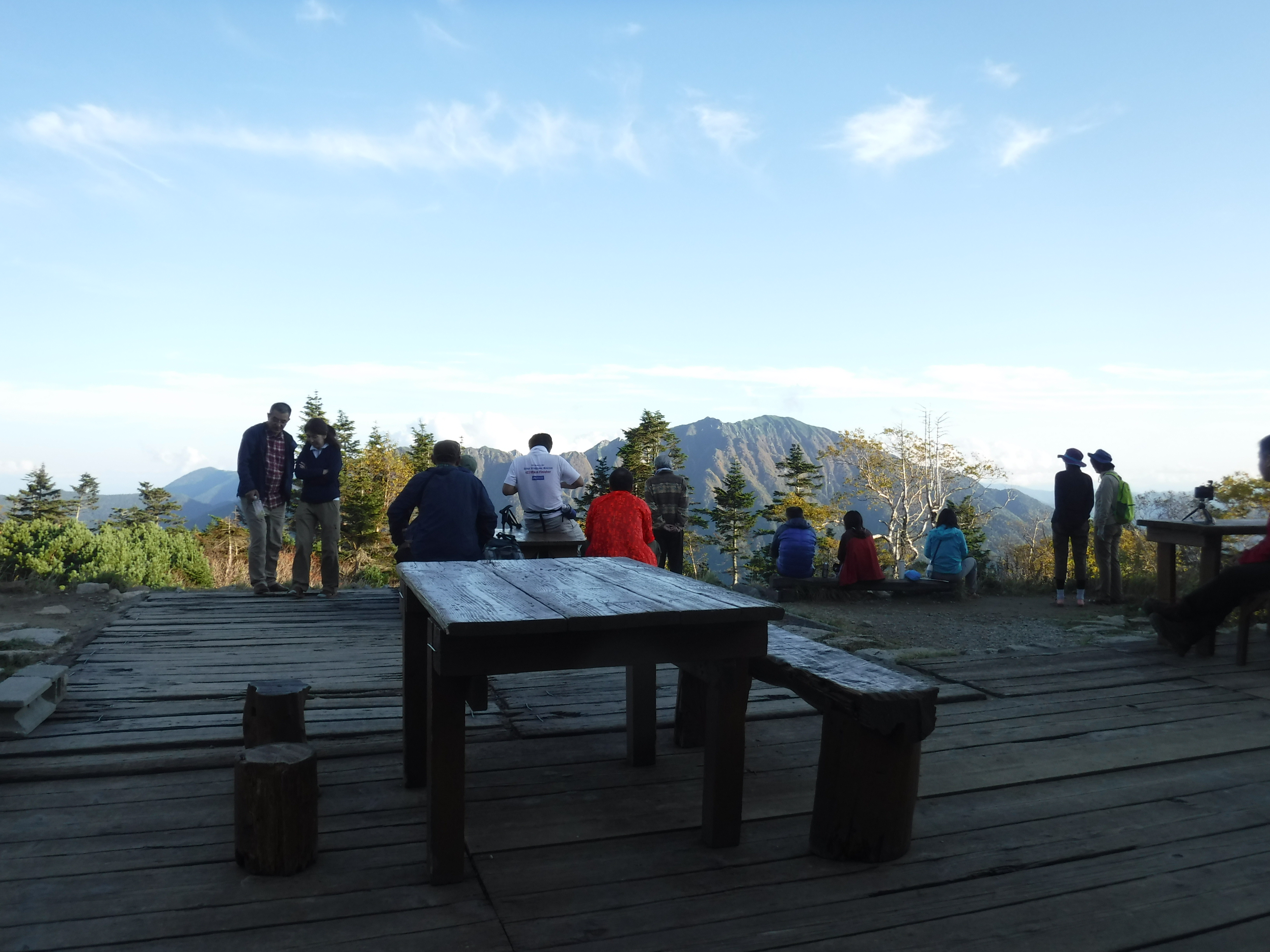 山荘前では、夕食までの時間をゆっくりと味わっている人が大勢いました。 |