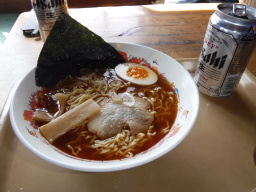 名物のラーメンで昼食タイム。みそと醤油があり、しょうゆを注文。味はチキンラーメンみたいでした。まぁ山で食べるものは何でも旨いです。 |