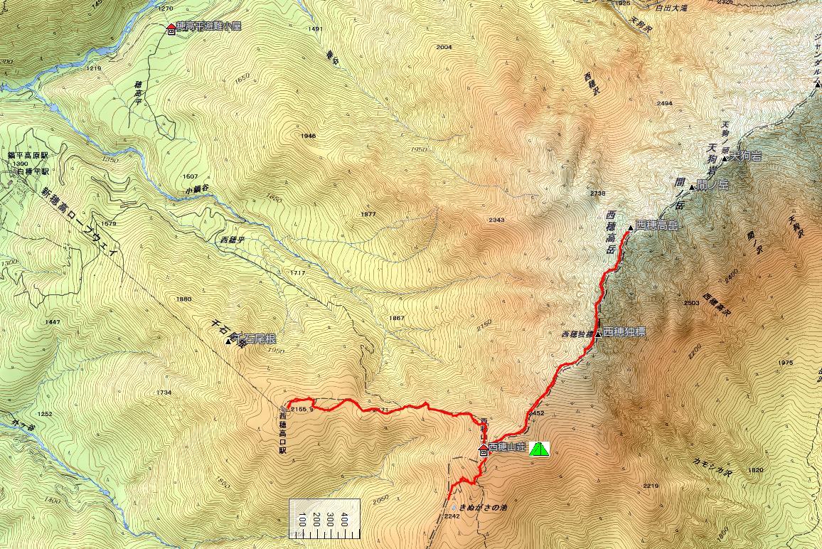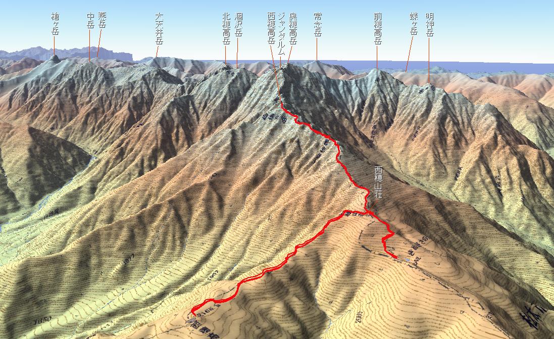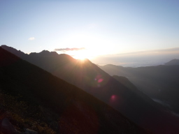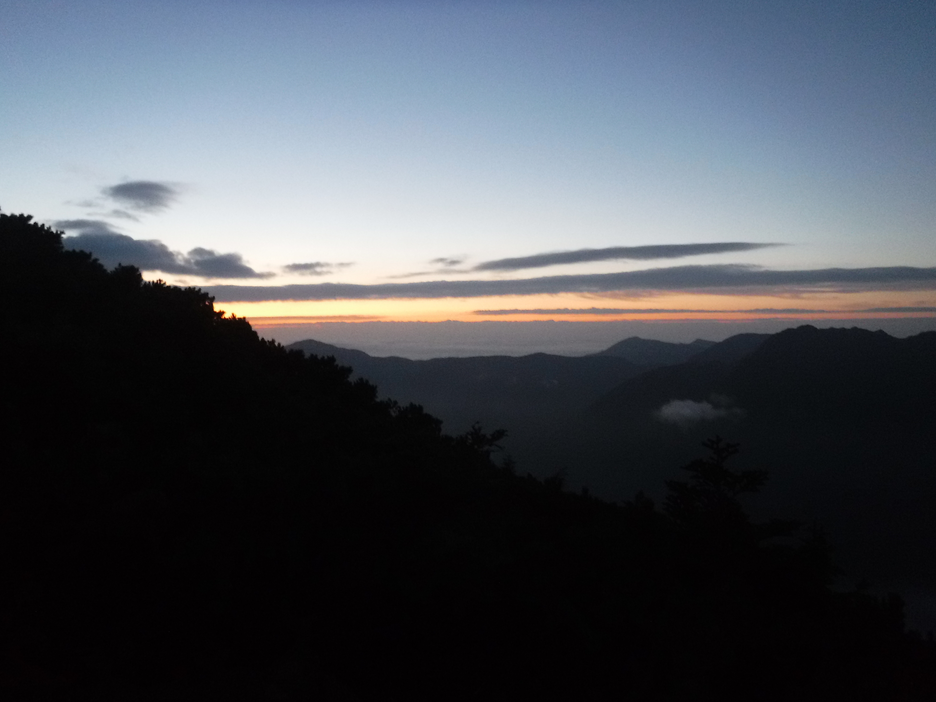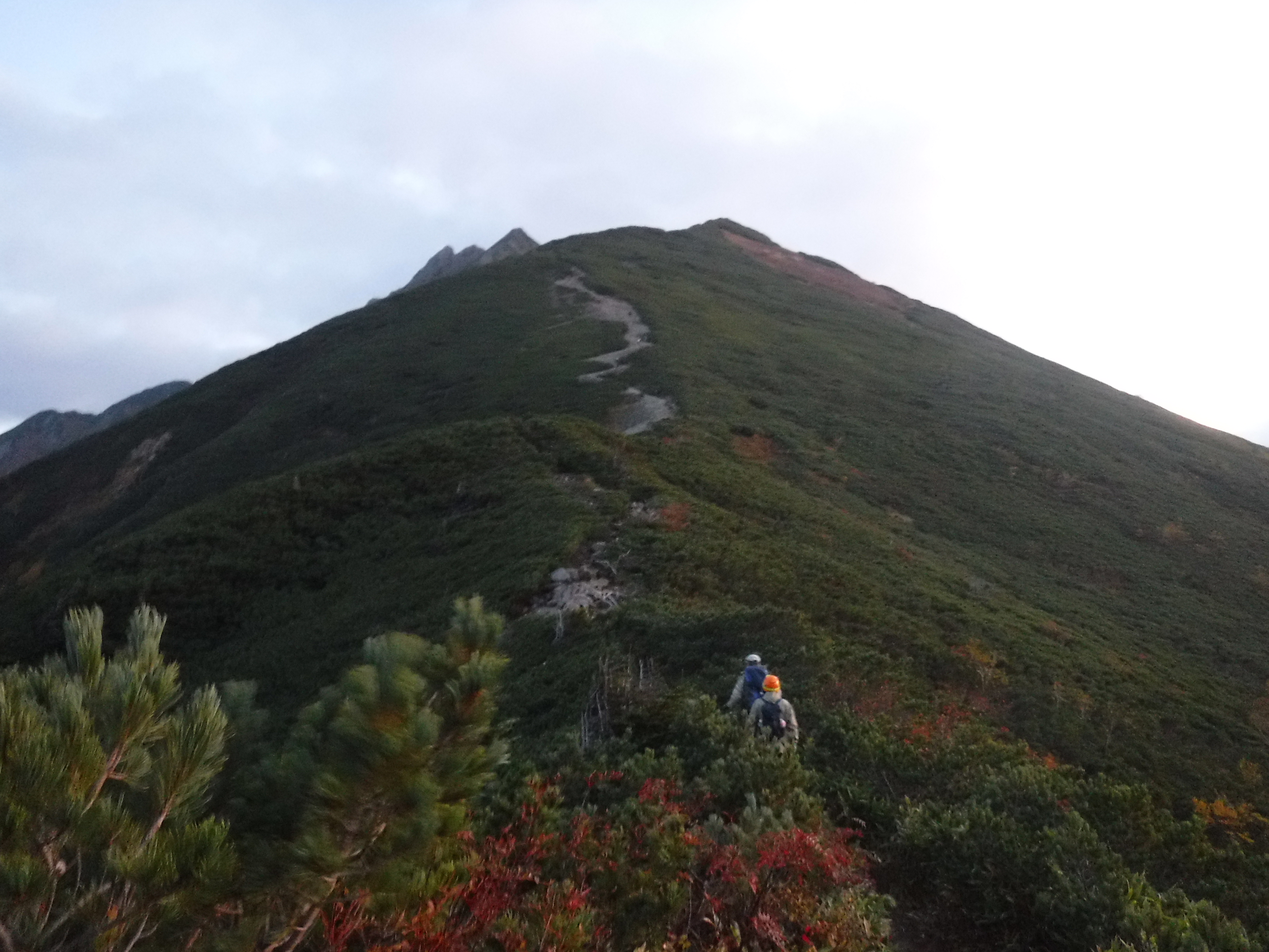 山荘までの登山道からは明日登る予定の登山道がよく見えます。明日もこんな天気だったらいいんですが、明日の天気は下り坂みたいです・・ |