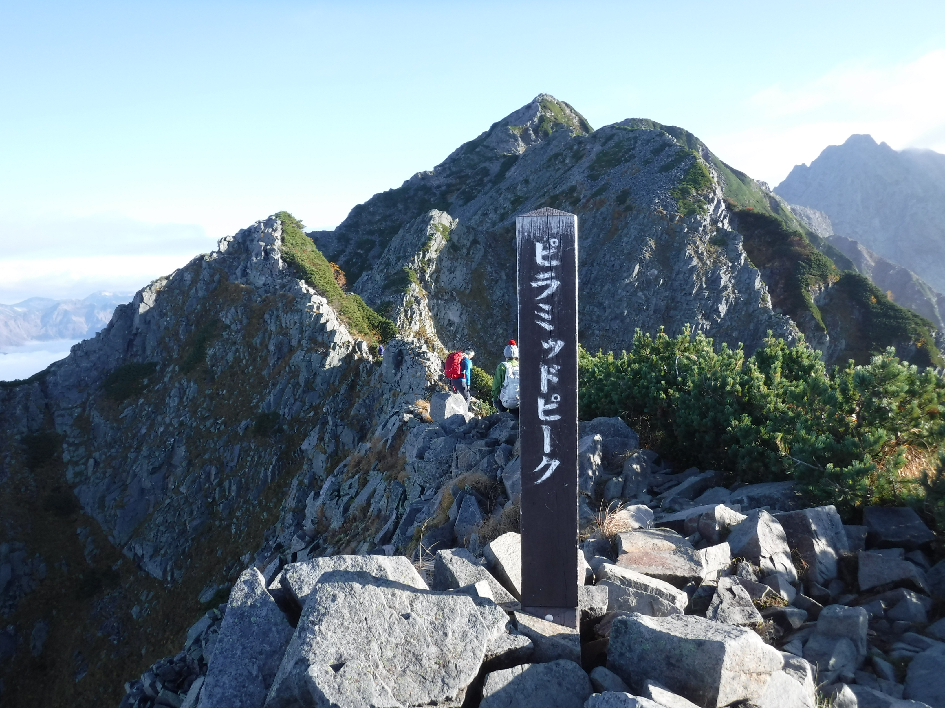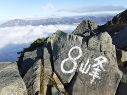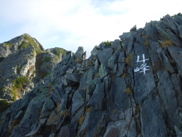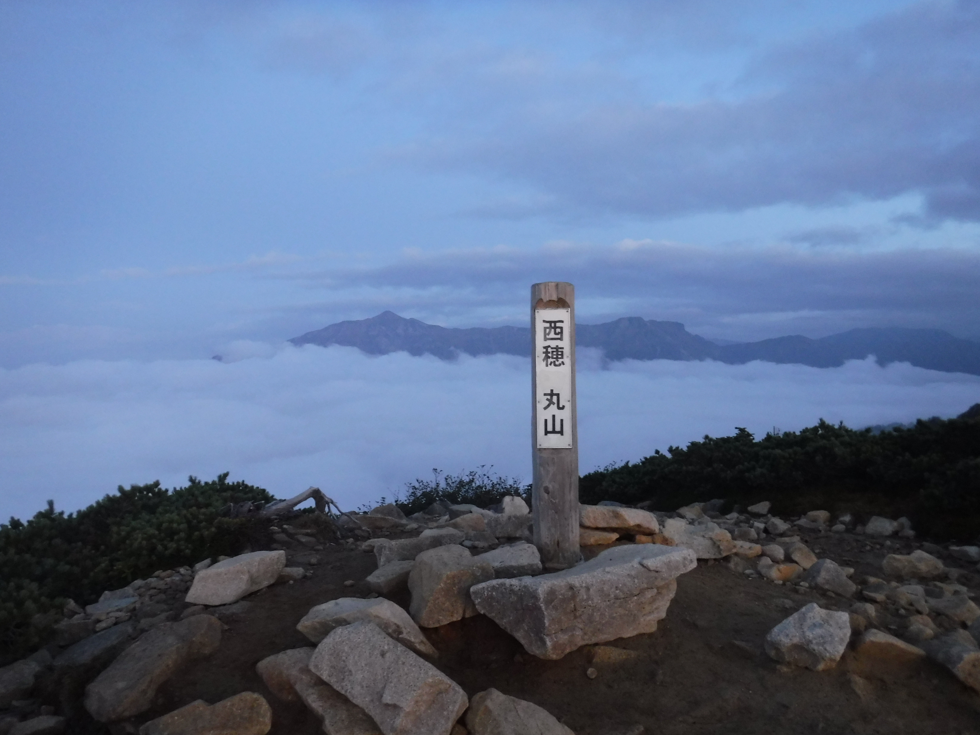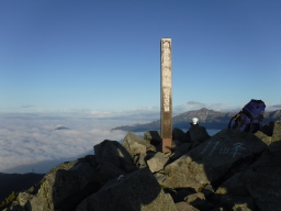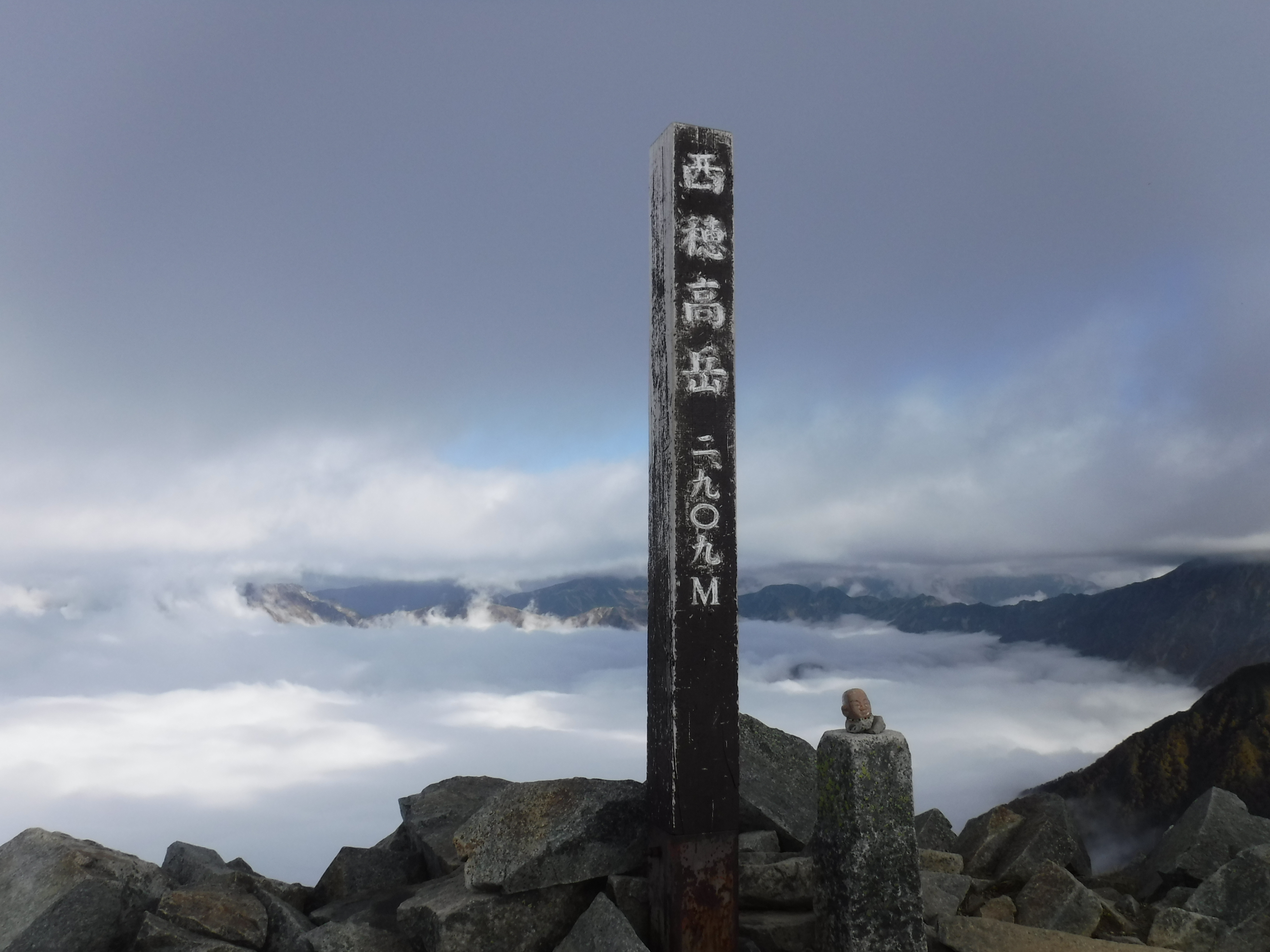 いくつかの小ピークを越えてやっと西穂高に到着しました。だんだんとガスが増えてきましたが北アルプスの山々が一望できました。 |